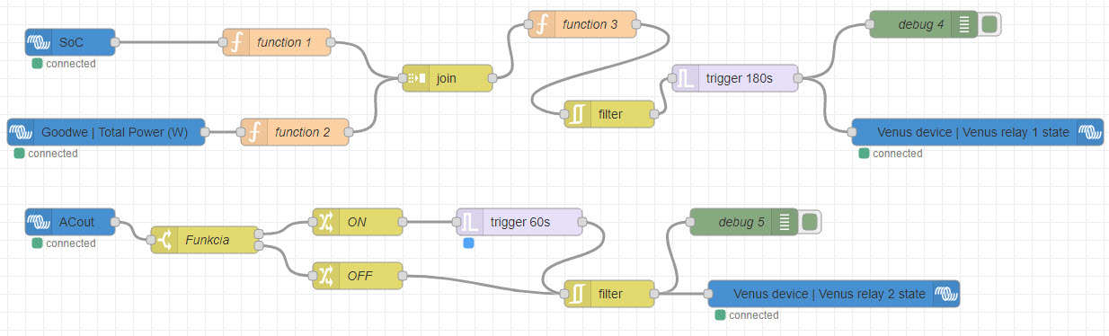 Ahoj, chtel bych poprosit, mohl by mi nekdo z vas, kdo ma Victrona a resi prebytky vyrobene energie vybitim do topne spiraly v zasobniku TUV (rele AC2 out) - mohli by jste mi poslat vase flow z NODE-RED? Jde mi o to, ze nejsem programator a jakmile si vymyslim nejakou funkcionalitu, tak nejsem schopny se nikam pohnout, protoze se nechytam s FUNKCEMI