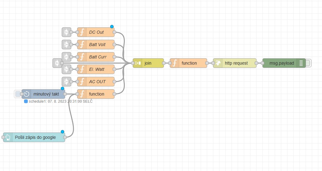 omlouvám se, unikla mi otázka, tak třeba je ještě dotaz aktuálnískybor píše:Ahoj, hele tohle mne zajímá. V nodered mám již pár věcí udělaných. Ale tohle by se mi taky hodilo. Mohl bych poprosit o nakopnutí, jak posílat data do google tabulky? A ještě jak docílit toho, aby to tam posílalo v určitých intervalech?mmv píše:v minutovém taktu posílá vybrané hodnoty do gůgl tabulky