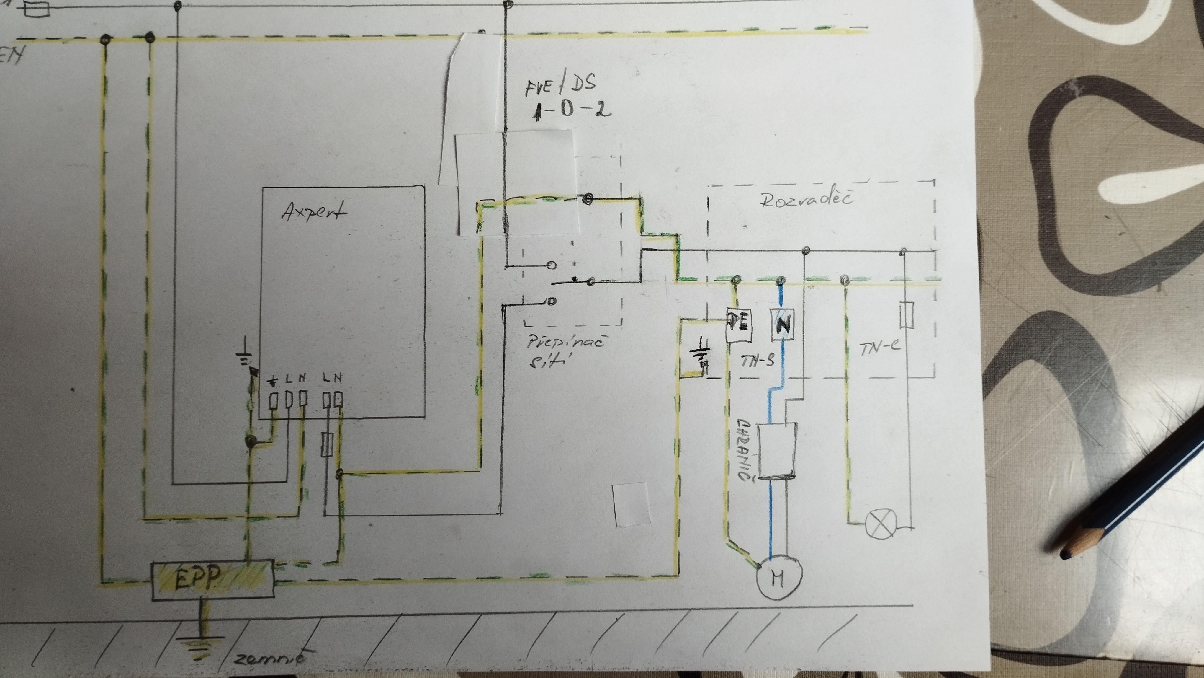 Ta žlutozelená odbočka od axperta do rozváděče je nadbytečná.