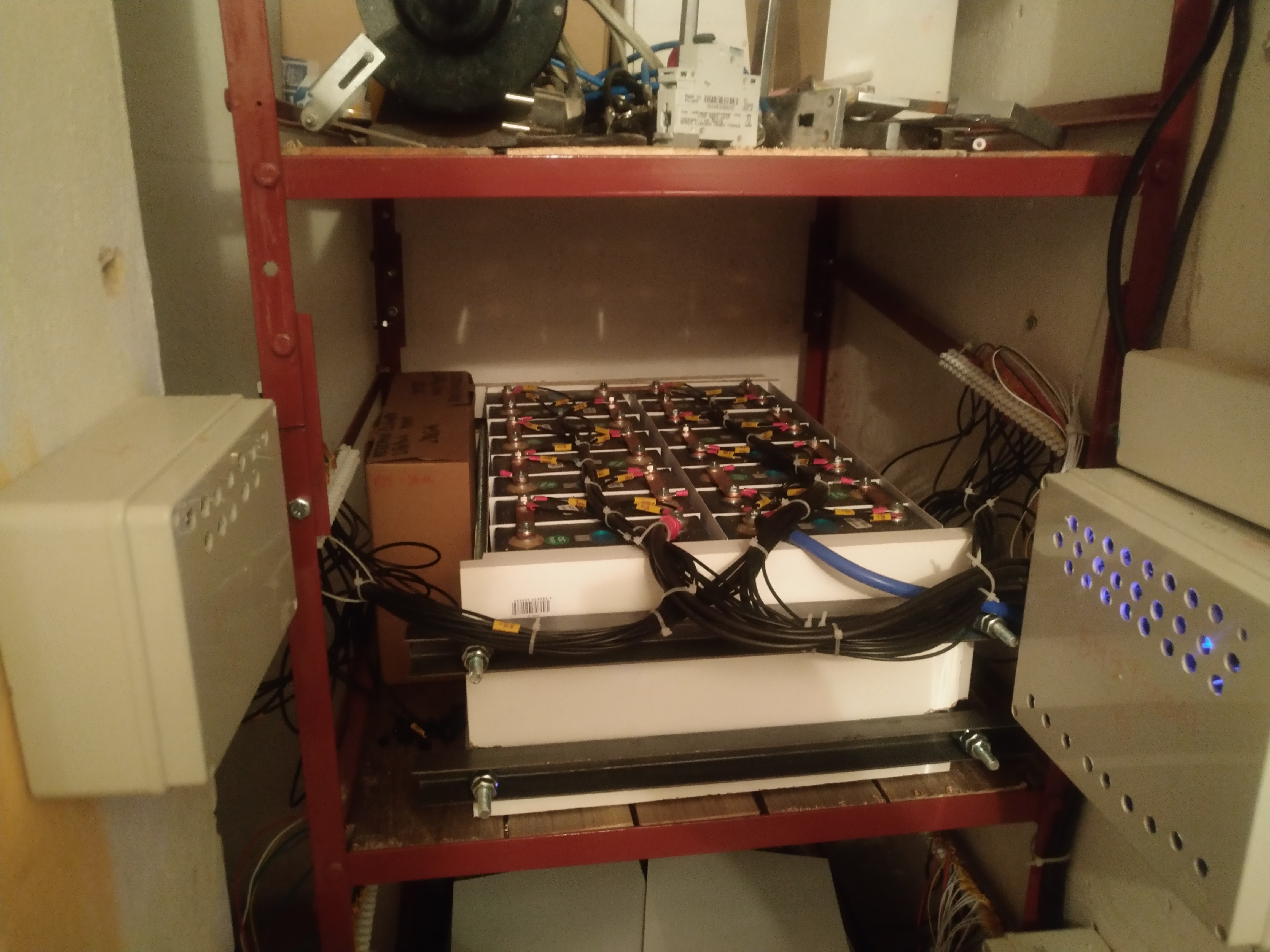 Dále mám k bateriím paralelně připojené 200Ah olovo. Jako záchrannou brzdu. To už je slabší, proto ho časem plánuji nahradit olověnou baterií (ještě nevím jestli novou, nebo repasovanou z VZV) o kapacitě tak 400 až 600Ah. Tady se mi líbí možnost instalovat po jednotlivých článcích po 2V s tím, že uvažuji instalovat článků 23. Jelikož mám nabíjecí napětí 54,8V a udržovací 54V mi při 23 článcích vychází lepší napětí na článek olověné baterie.