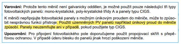 Ano, já bych pouze dodal, že není dobré přizemnit "moc dobře". Metr kolík ok. V2A (nebo teda pozinkovaný šit) páska kolem baráku ... taky ok.solárník píše:c) bez uzemnění by do izolované soustavy (ostrov) po zemi nic téci nemělo, ovšem to je jen ideální případ. Jakýkoli síťový střídač, nabíječka nebo podobné zařízení do soustavy zavleče parazitní proudy směrem do distribuční sítě a pak to bez zemnění začne blbnout viz příklad mého kamaráda. Další otázkou je, že zcela izolovaná soustava s panely umístěnými na střeše - tam je holé šílenství se domnívat, že se to vyhne indukci statické elektřiny. Tedy taková soustava může dosahovat potenciálu pěkných pár stovek voltů, napřiklad před bouřkou. Z toho všeho mi vychází, že je asi opravdu lepší přizemnit, pokud je to možné.