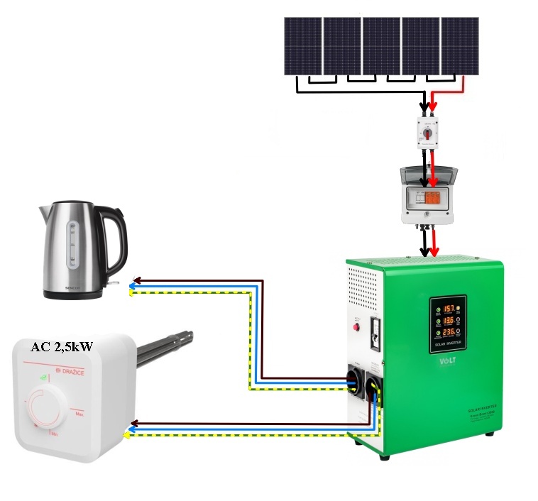 Pokud se však na výstupu č.1 připojí zátěž ( vařič,remoska, rychlovarná ) tak se výstup č.2 odpojí a celý výkon FV je přenášen na výstup č.1.