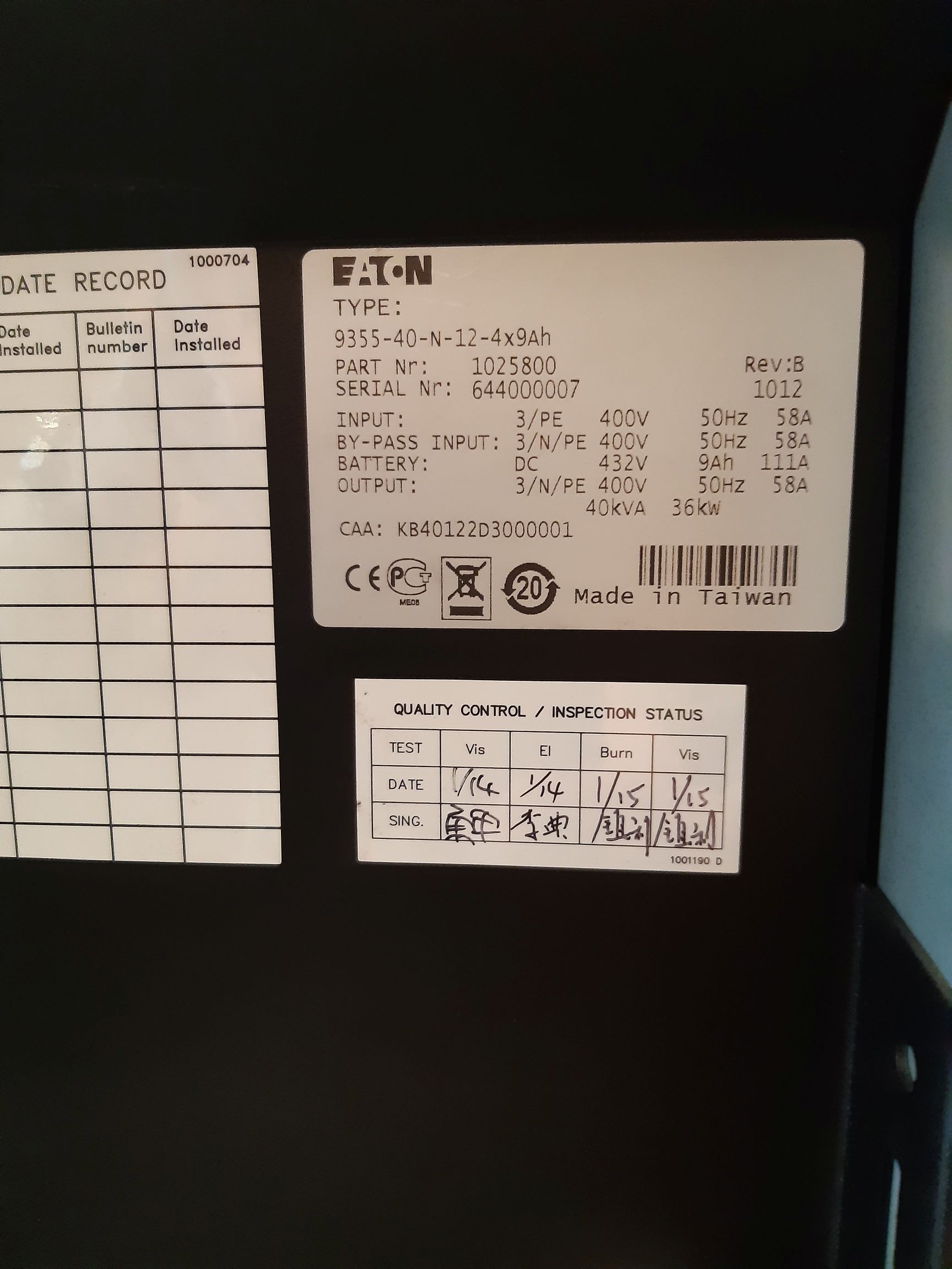 Nabízím k prodeji 3 fázovou UPS záložní zdroj EATON vč. akumulátorů, typ PW 9355 40 kVA (36kW), rok výroby 2010.