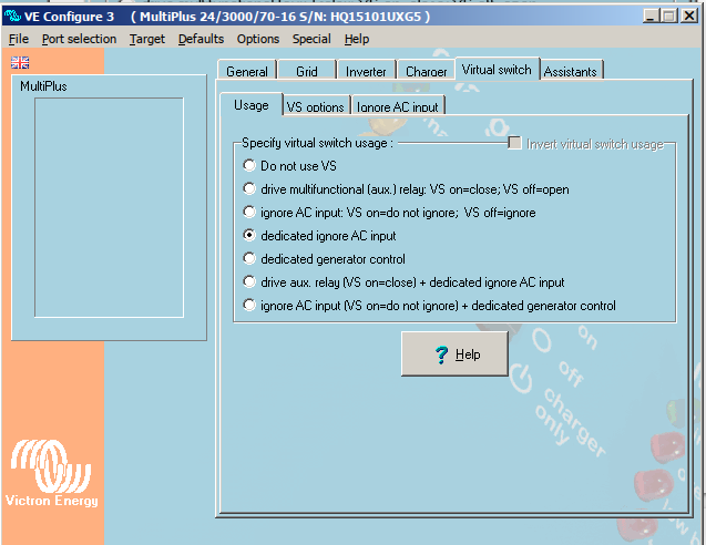 Používám virtual switch a ignore AC, v té jednodušší verzi, rád bych přepínání na grid podle SOC, ne podle napětí.