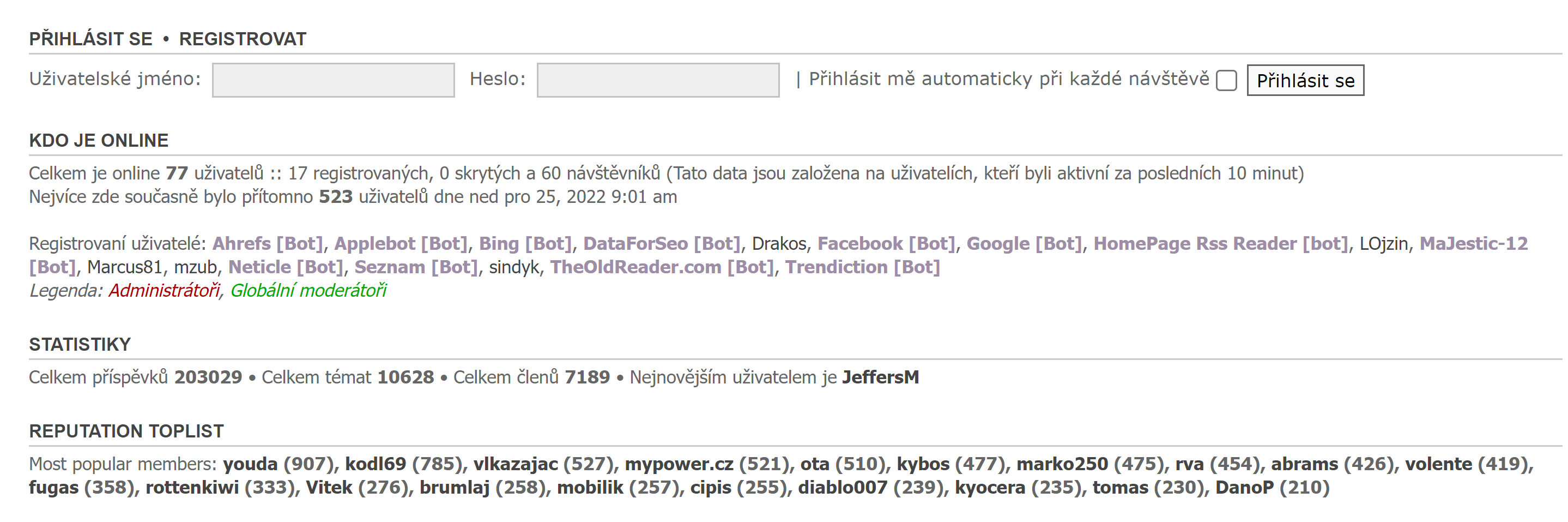 Reputační toplist: v šabloně zakomponován je, ale v nastavení reputací je vypnutý. K čemu je taková statistika dobrá? Zobrazuje počet lajků. Ty jména se vzhledem k počtům lajků nemění. Opět, klidně to zapnu, jen mi to přijde zbytečné.