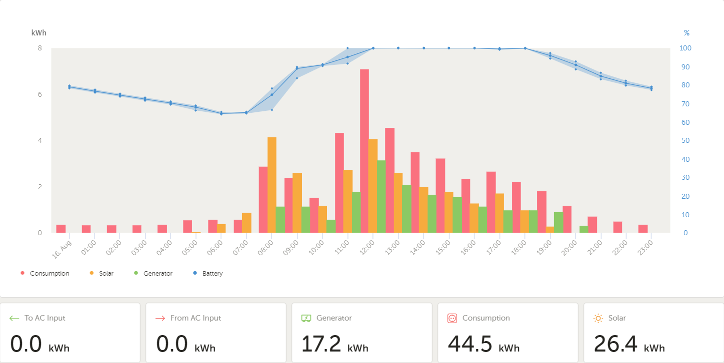 Drobná nevýhoda takovéhoto zapojení je zkreslený záznam spotřeby, protože energii vyrobenou střídačem 1 započítává do celkové spotřeby 2x, jednou jako solar a podruhé jako generátor. Včerejší záznam: