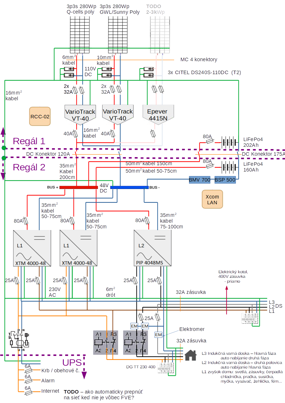 1) nemozes mat privedeny L1 na prve XTMko a L2 na druhe XTMko a potom to spojit do jednej ked mas jednofazovy dom, lebo ked pretazis menice, oni ti to cez transfer rele spoja dokopy a bude veselo.