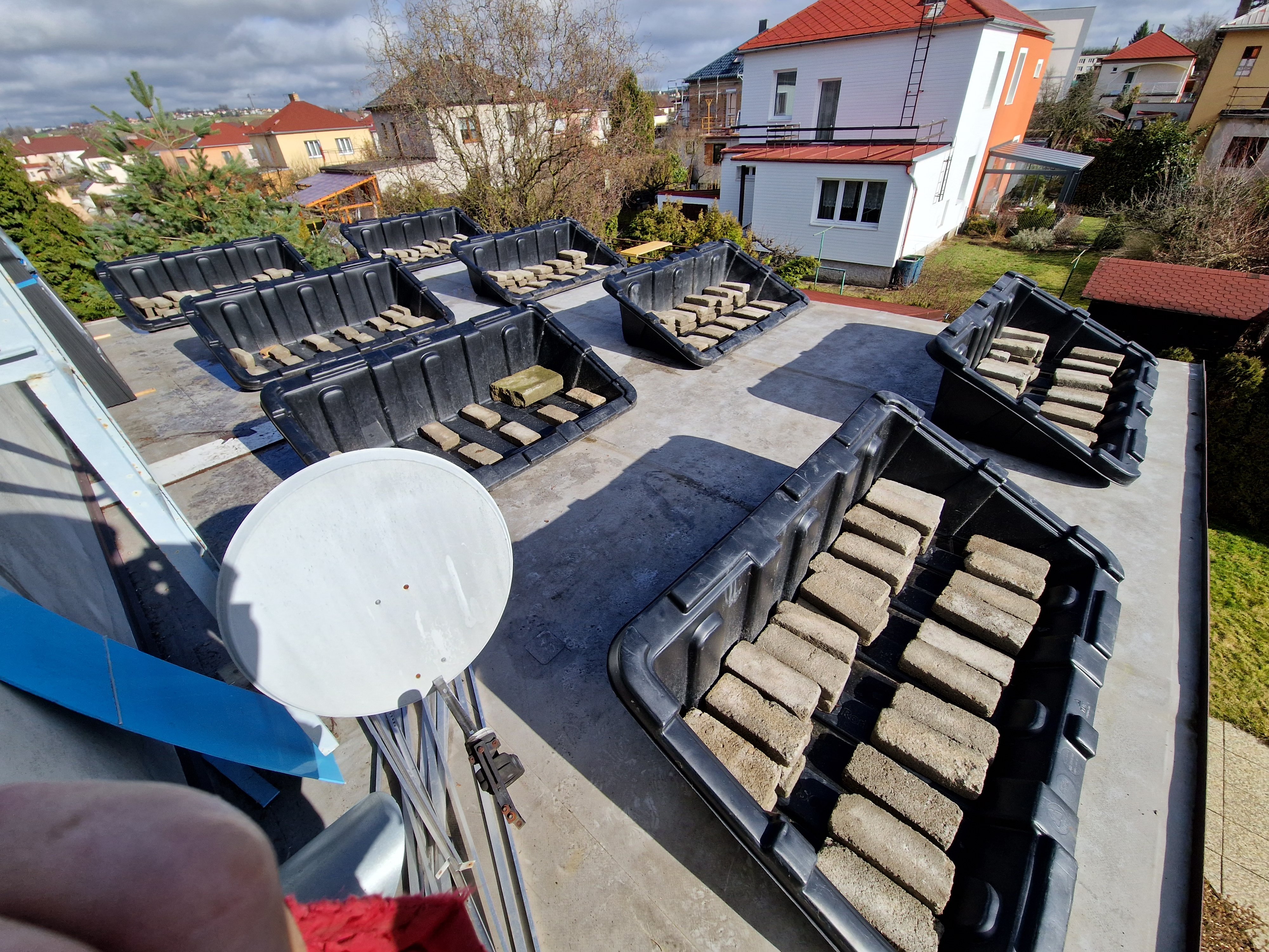 Tak jsem trochu nabral zpoždění. Nyní jsem v druhé fázi. Rozmístil jsem vaničky Renusol console 6.2 na přístavbu a nanosil závaží. Podle návodu v nich má být 134kg v krajních a 83kg v těch co nejsou na kraji... Mám v ních 140 na kraji a 96 uprostřed. Ale nezdá se mi to, na střeše mám takový ten šedý svařovaný plast, asi fatrafol. No a když je to mokré tak to dost klouže a i s naloženýma vaničkama jsem schopen šoupat po střeše. Takže by asi bylo vhodné něco mezi voničku a střechu co neklouže. Doporučíte nějakou podložku? Navíc panely budou větší než vanička. Panel má 228*113cm, takže přesah panelu bu]de 27cm na kažou stranu a cca 10cm dozadu. Takže asi i navýšení hmotnosti, ale o kolik? Není někde nějaká kalkulačka? Nic jsem nenašel...