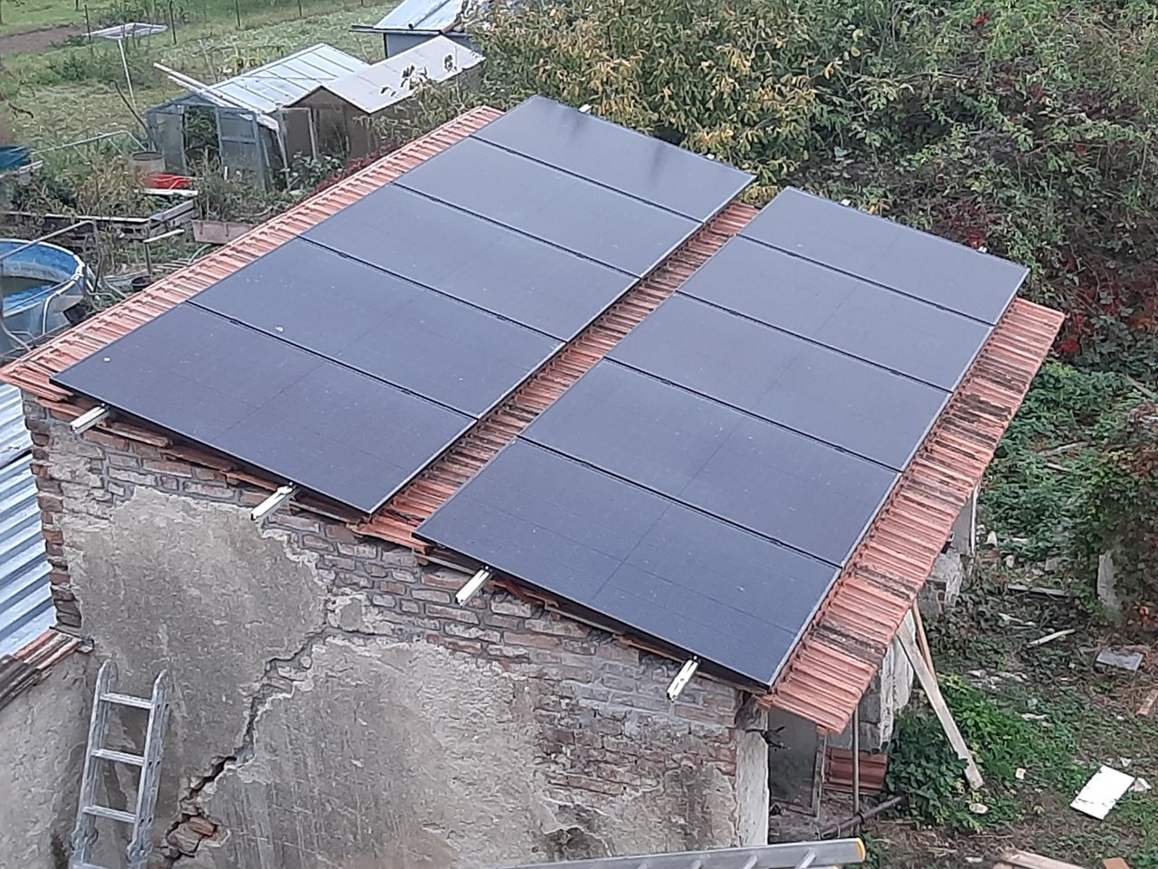 Po delším čase konečně nějaká změna. :celebrate1: Plán na rozšíření byl již loni v květnu. Panely ležely už přes rok opřené o zeď, ve třech štosech po čtyřech a jen vrchí tři byly zapojené, aby to dělalo alespoň něco. Hlavní problém totiž byl, že se ukázalo, že střecha dílny (tehdy ještě pojmenované dřevník/sušárna) byla v havarijním stavu a místo výměny jedné krokve bylo třeba vyměnit i horní pozednici podepřenou jen na třech pilířích, takže šlo pryč všechno dřevo a na střechu nové. Dům v rekonstrukci, zobytněna jen část místností, takže to nemělo moc prioritu, až nyní na to vyšla řada.
