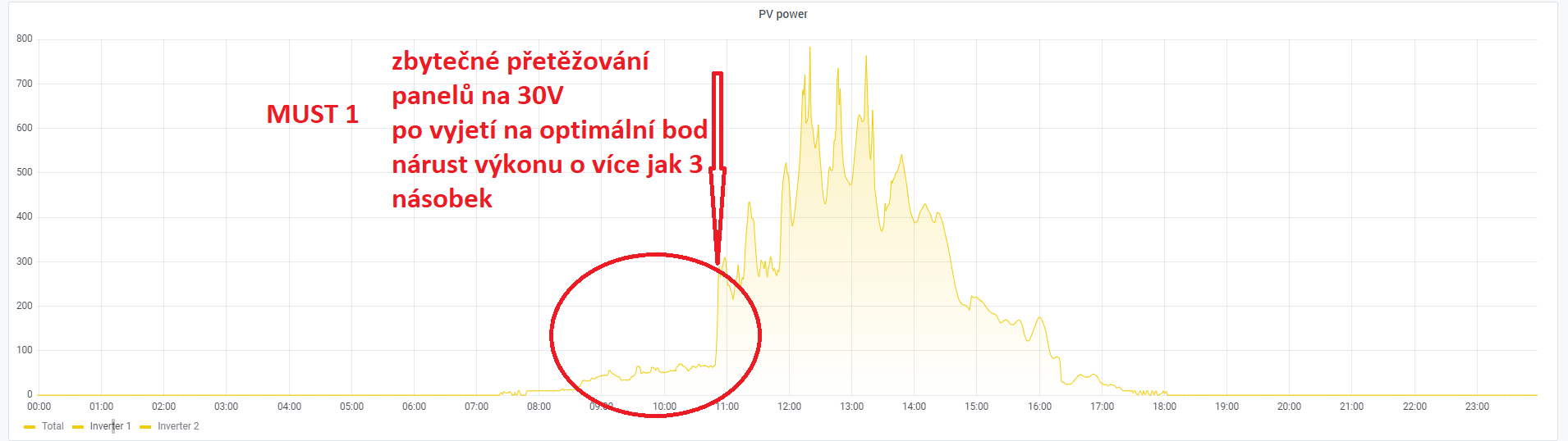A teď dnešní chování MUST 1 má více panelů no i přesto "přetěžoval" panely dost dlouhou dobu a okrádal tak zbytečně potencionální výrobu...