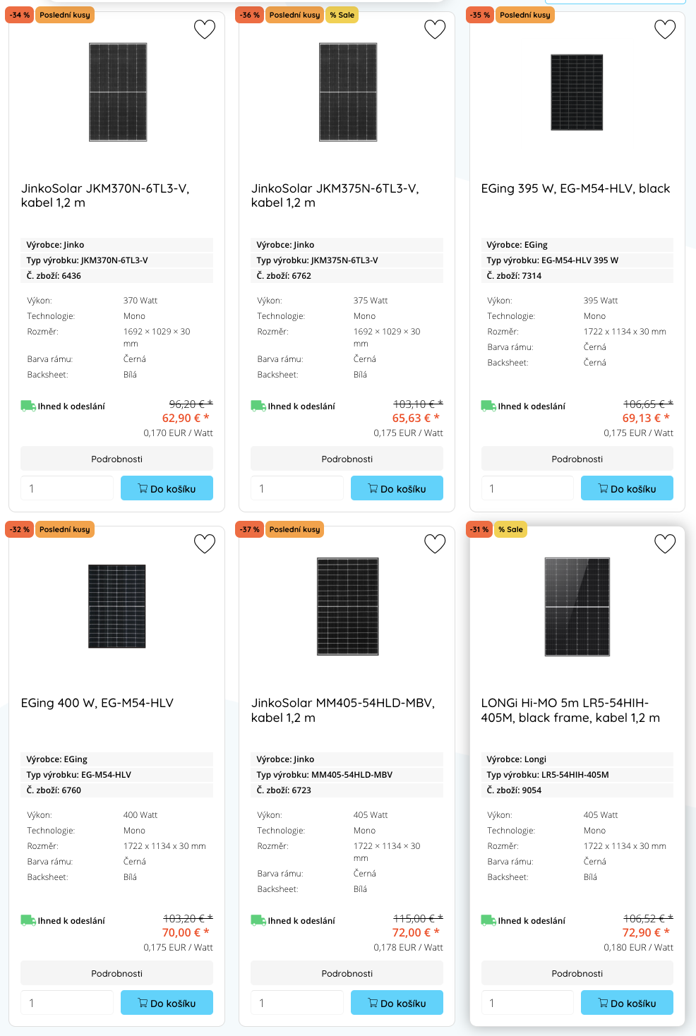 Mrkni třeba na Memodo. Loni jsem tam kupoval bifacial panel za 150 EUR, teď stojí stejný 85 EUR.