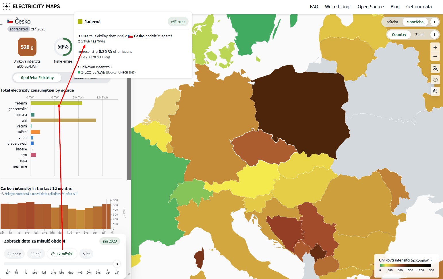 Narazil jsem na tenhle web, který zobrazuje ekologičnost výroby elektrické energie v rámci jednotlivých států. Bohužel nejspíš si data cucají z prstu nebo v tom neumím číst. V grafu roční produkce v ČR je u jaderných zdrojů jen 2,7TWh, což když jen Temelín za rok vyprodukuje 15TWh a máme ještě Dukovany, tak to zřejmě nesedí. V roce 2022 jsme vyrobili v ČR celkově 84,5TWh a i přes výrazné zdražování jsme spotřebou určitě neklesli 13x na 6,5TWh.