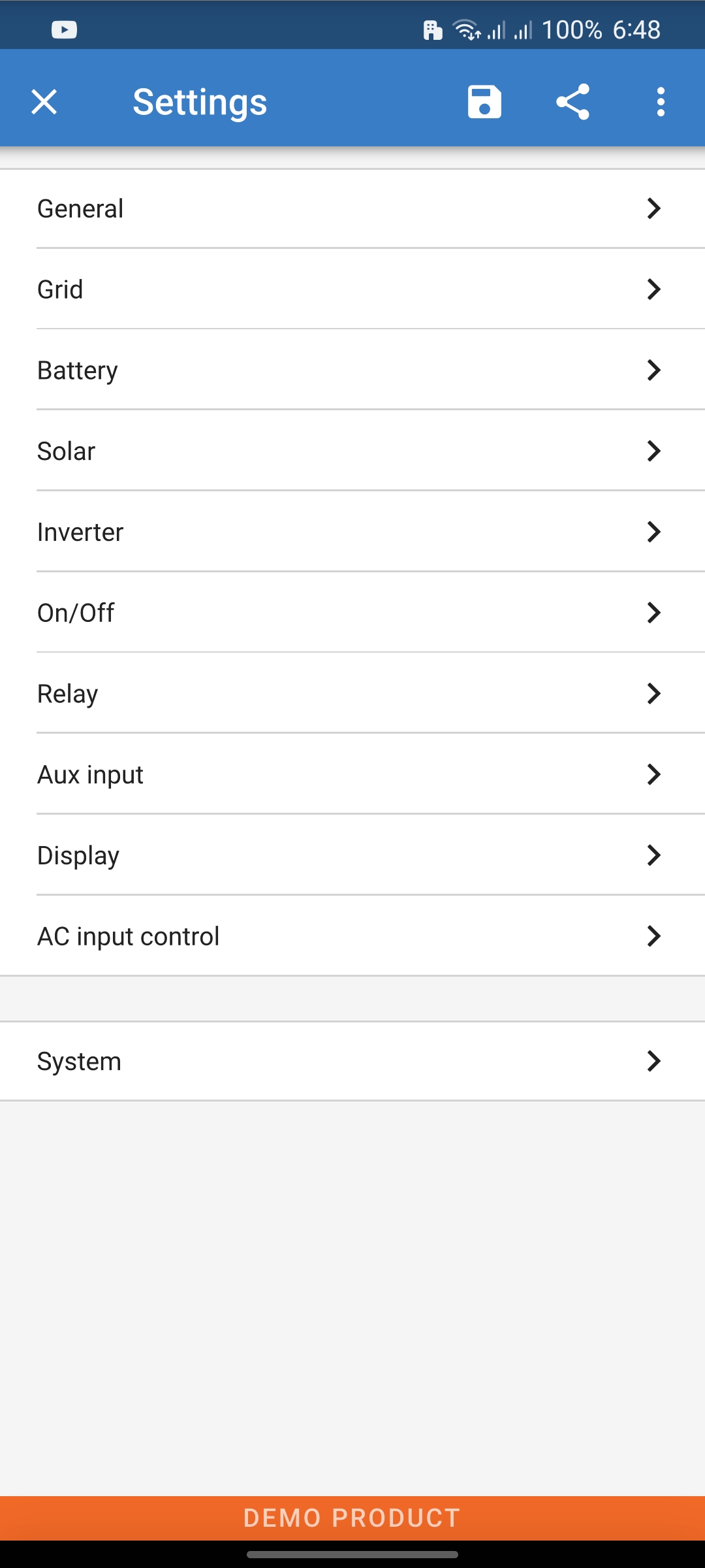 Tak ještě tedy pro pána v předu. Když si pustím VictronConnect tak nahoře dám menu(tři čárky nalevo nahoře) tam dam demo knihovna. Poté si všichni mohou podívat na každý produkt co ma VictronConnect. Je to demo se vším všudy. Vidíš všechny parametry, jako by jsi to měl na stole.