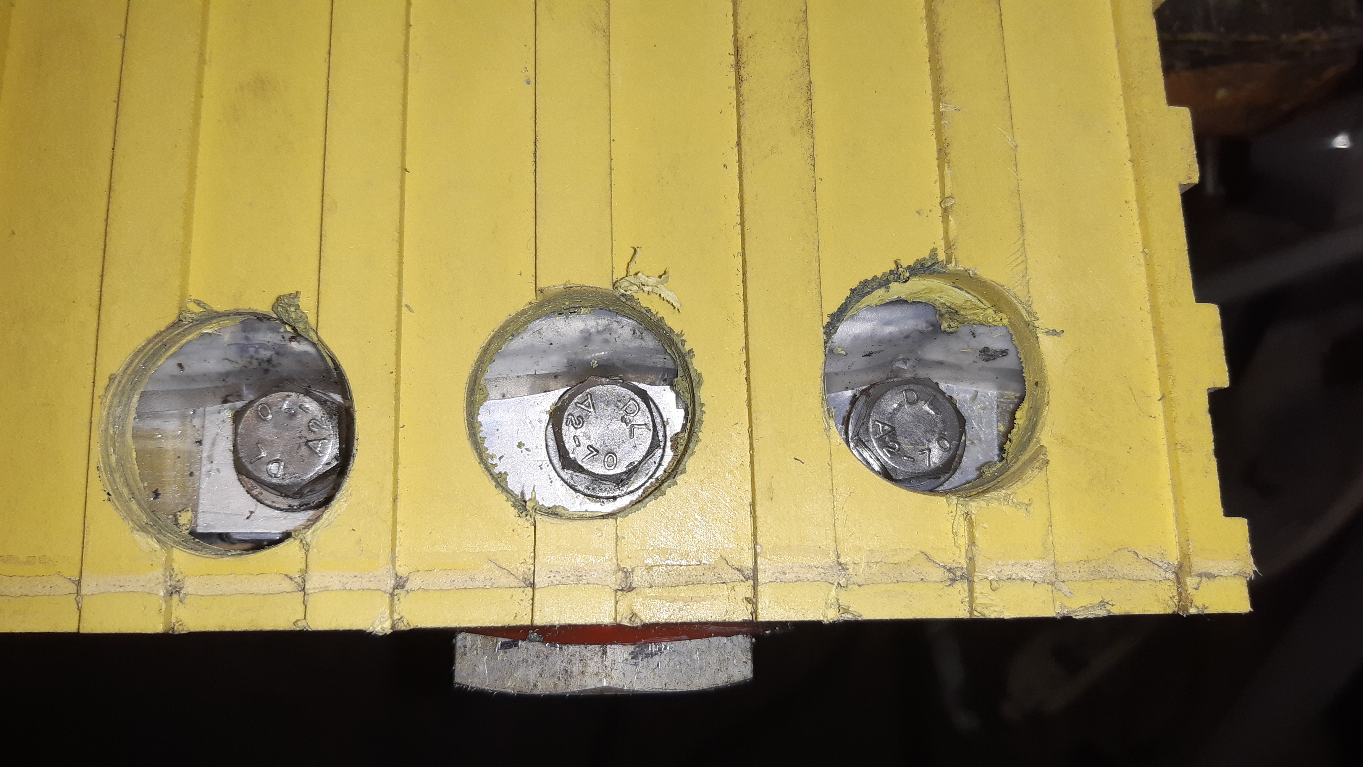Nuže jsem se po vzoru Oty jal píliť a vrtat (viz obrázky) ten kus s nejvyšším odporem. Nejdříve jsem jako Ota divokým vrtáním vykružovákem odkryl prostřední sběrnicový šroub a matku. A zde POZOR! Odlišná situace. Byla sežraná pouze pérovka, podložka i matka byla z antikora a v pořádku. Nicméně, to, že pérovka "zmizela", způsobilo totální uvolnění spoje. Antikorové pérovky nemaje, vzal jsem solární antikoro matku s hřebenovou přírubou proti roztažení a nahradil starou matku i podložku. Dotáhl golou na krev a nedostal jsem se pod 1 miliohm, což je stále poměrně nepoužitelné. Nuže, vybaven notnou dávkou adrenalinu, jsem vykroužil všechny tři šrouby kladné sběrnice a pro jistotu ještě jeden na záporné pro kontrolu stavu. Záporná elektroda je skutečně naprosto v pořádku, celý spoj stále utažen a drží dobře. Mimochodem, ten smrad z té baterky, to je masakr, doporučuji lakýrnickou masku s uhlíkovým filtrem, kterou jsem záhy raději nasadil.