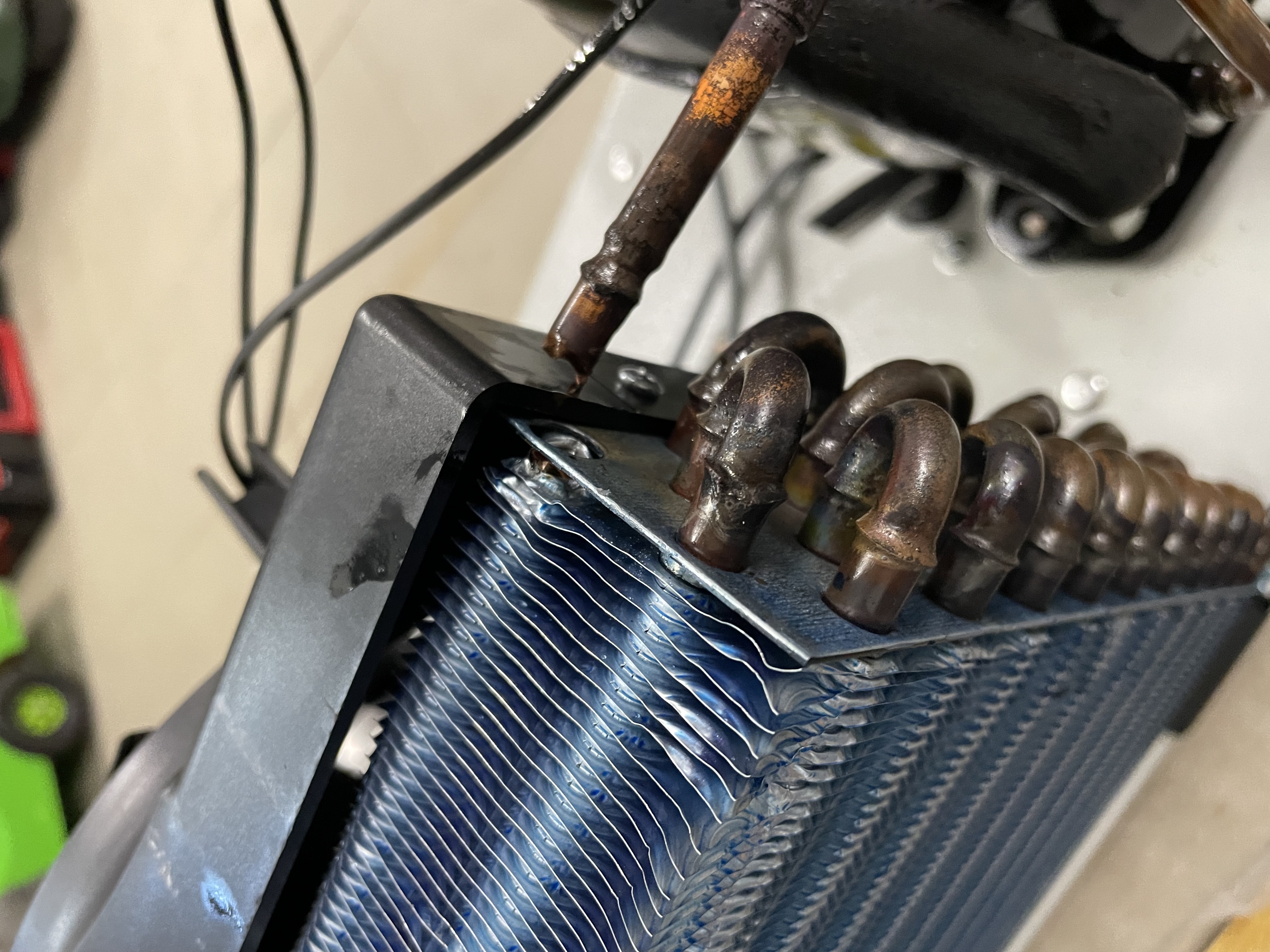 Když to reklamuješ, tak jsi na to neměl šahat. Podle mě to není přepravou - při přepravě se šoupou palety na pumpiku. Tohle někomu spadlo ve skladu, takže to mohlo být otevřené klidně několik měsíců. Ten výměník je obtížně opravit. Je to utržené pod lamelami - blbý přístup, obtížné to prohřát. Je třeba pájet pod dusíkem, jinak jsi v trubkách vytvořil další bordel. Nejlépe pak použít ecoflush a výměník propláchnout (což je cenově mimo). Degradovaný olej v kompresoru nejde vyměnit. Jak píše @eman, oprava jsou vyhozené peníze.