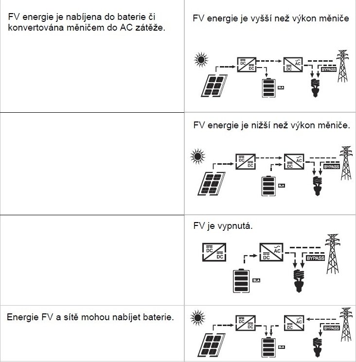 A nebo režim z baterky (režim SOL nebo SBU) kdy jede z baterky pořád a pouze jak klesne napětí na baterce pod nastavenou mez přepíná na DS a čeká než stoupne na baterce napětí nad nastavenou mez.
