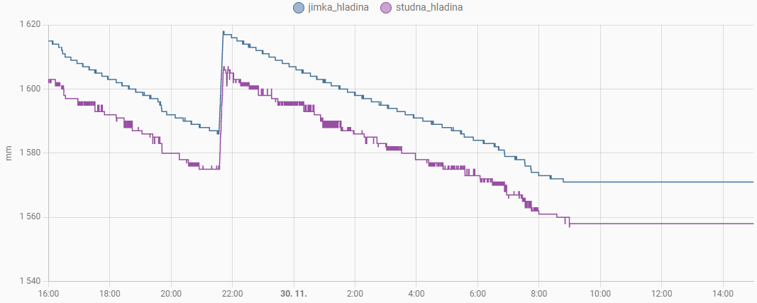 Ten lineární pokles je reálný, jímka není těsná. Ten skok nahoru je doplnění vody z vrtu. Ta rovina dneska od rána je odtávání sněhu ze střechy.