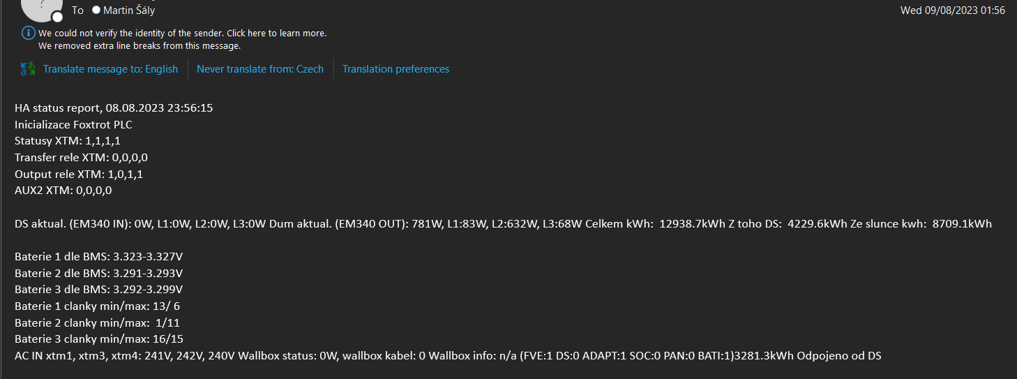 Foxtrot umí i posílat email, posílám si tak výstrahy, zachytávám situace jako: XTM vypnuto, automatický přepínač sítí přepnut na DS, příliš nízké nebo příliš vysoké napětí některého článku (ještě před zásaham BMS), příliš velký rozdíl mezi články BMS, nízká nebo vysoká teplota apod. Znovu zde pomáhají metadata - rozřišování je poměrně rychlé. Události loguji a pokud mají nastavenou vysokou prioritu, posílám tedy emailem: