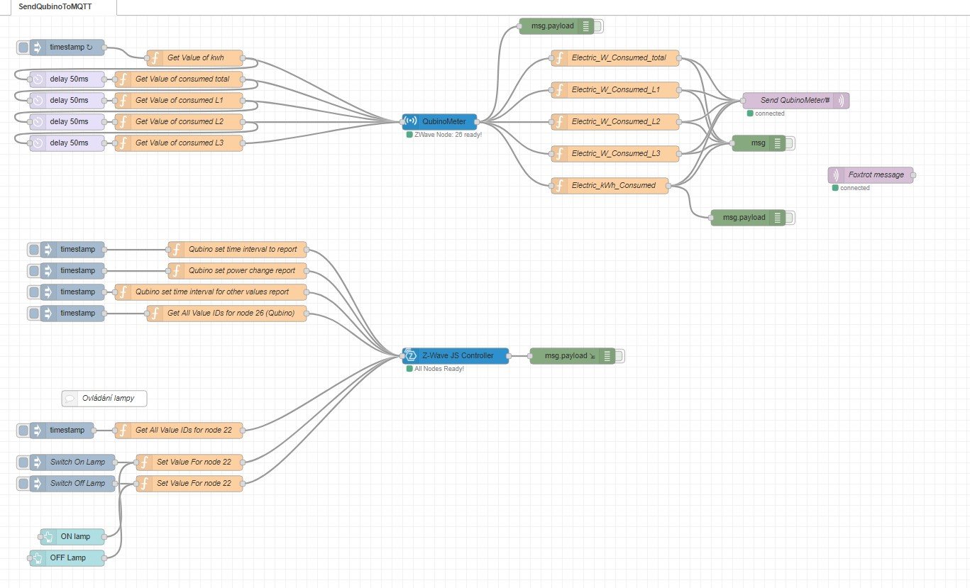 Historie: dříve jsem výstupní spotřebu měřil pomocí z-wave Qubino integrovaného s nodered+MQTT provozovanými na Intel Nuc, vše na Centos 7 s využitím dockeru a příslušných kontejnerů. Bylo to pokrokové, ale jednoho krásného dne Qubino nepřestalo měřit, ale přestalo předávat data do zwave. Takže jsem pořídil druhý EM340. Nechávám zde z nostalgie, protože nodered je krásný software: