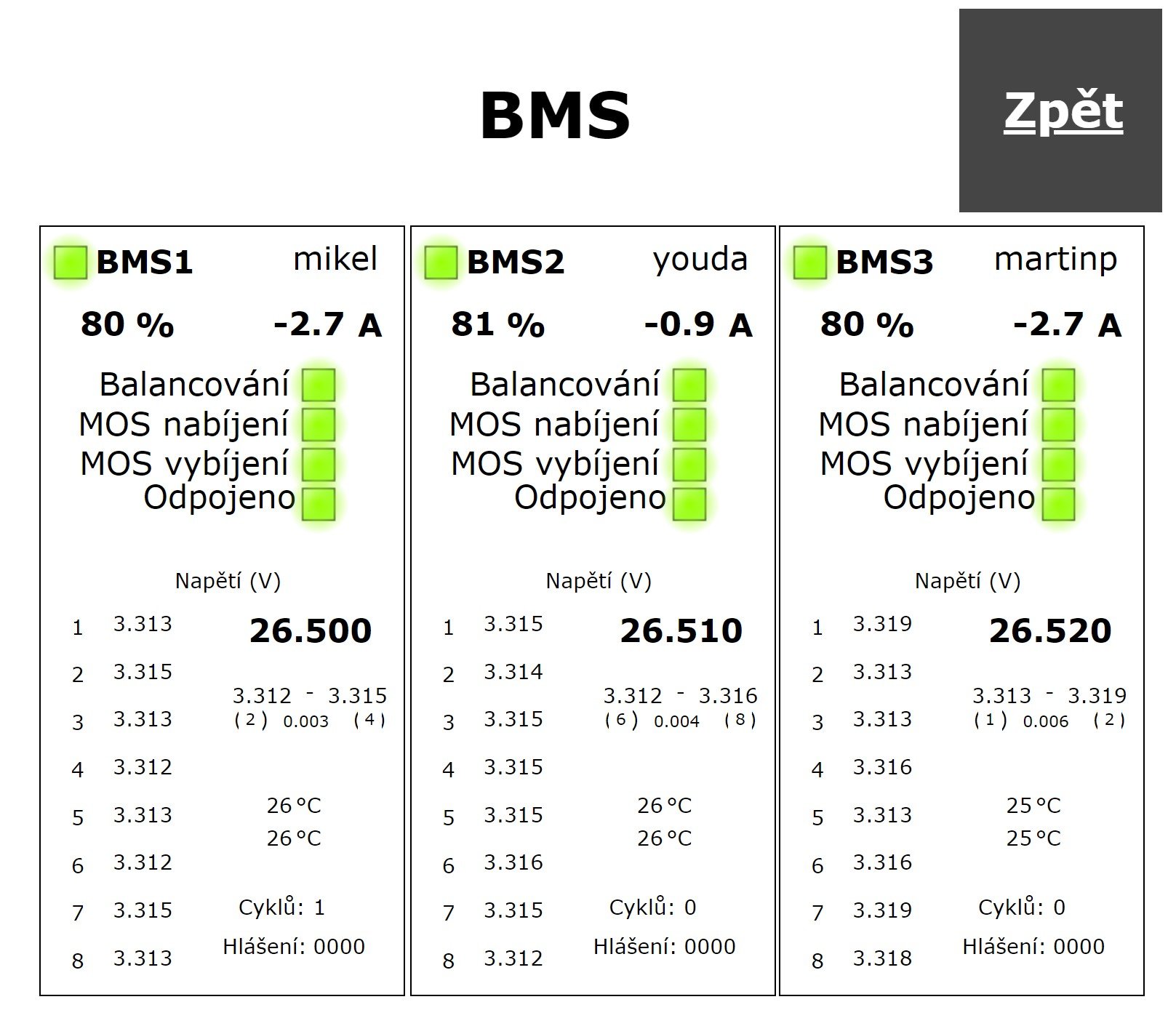 JK BMS tedy monitoruje jednotlivé packy, je také nastaveno hlídání chybových stavů se zasíláním zpráv o případných problémech.