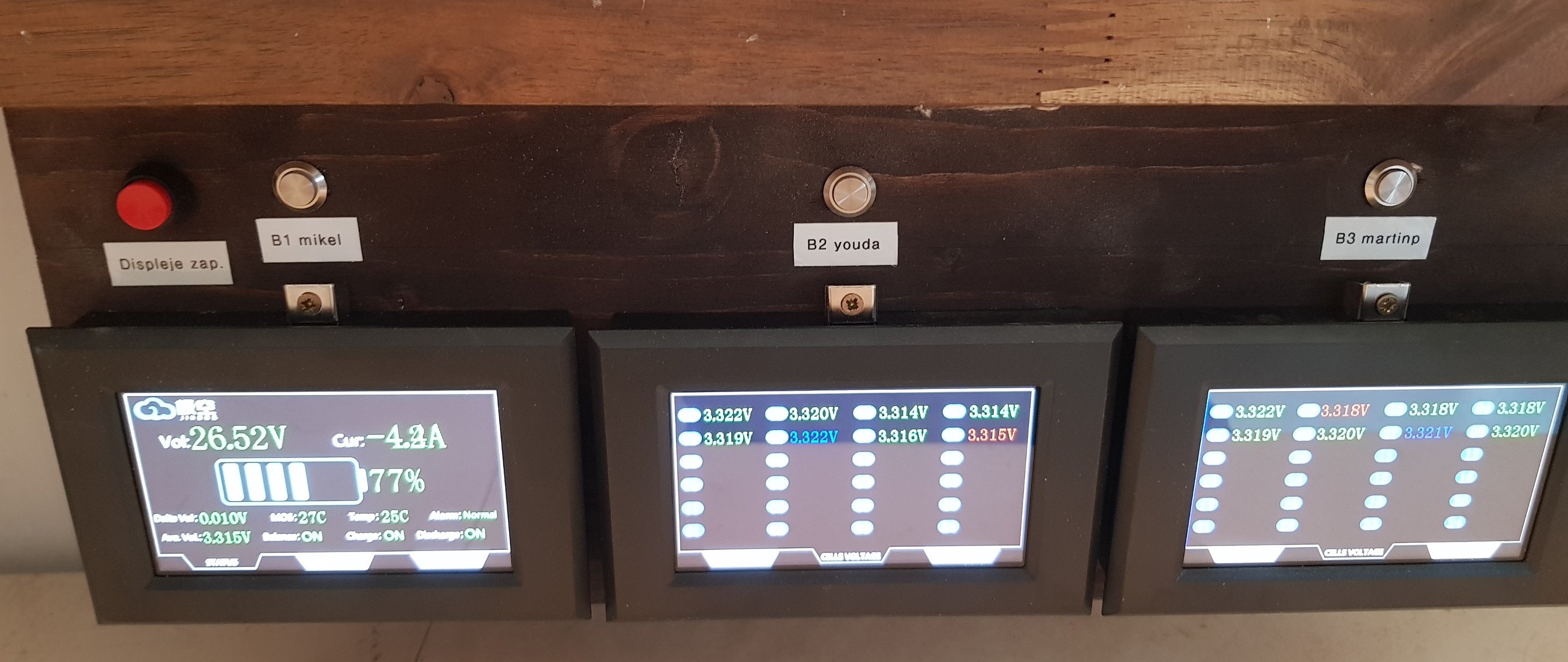 Baterie jsou: LiFePo 8x Winston 200Ah + 8x Winston 100 Ah + 8x CATL 120Ah, na nich jsou JK BMS, které mají 1A balancer. Mám i 4,3" displeje včetně alarm tlačítek (lze s nimi případně odpojit pack). Červené tlačítko je vypínač displejů. Packy jsou "personalizované" podle jmen dodatavatelů
