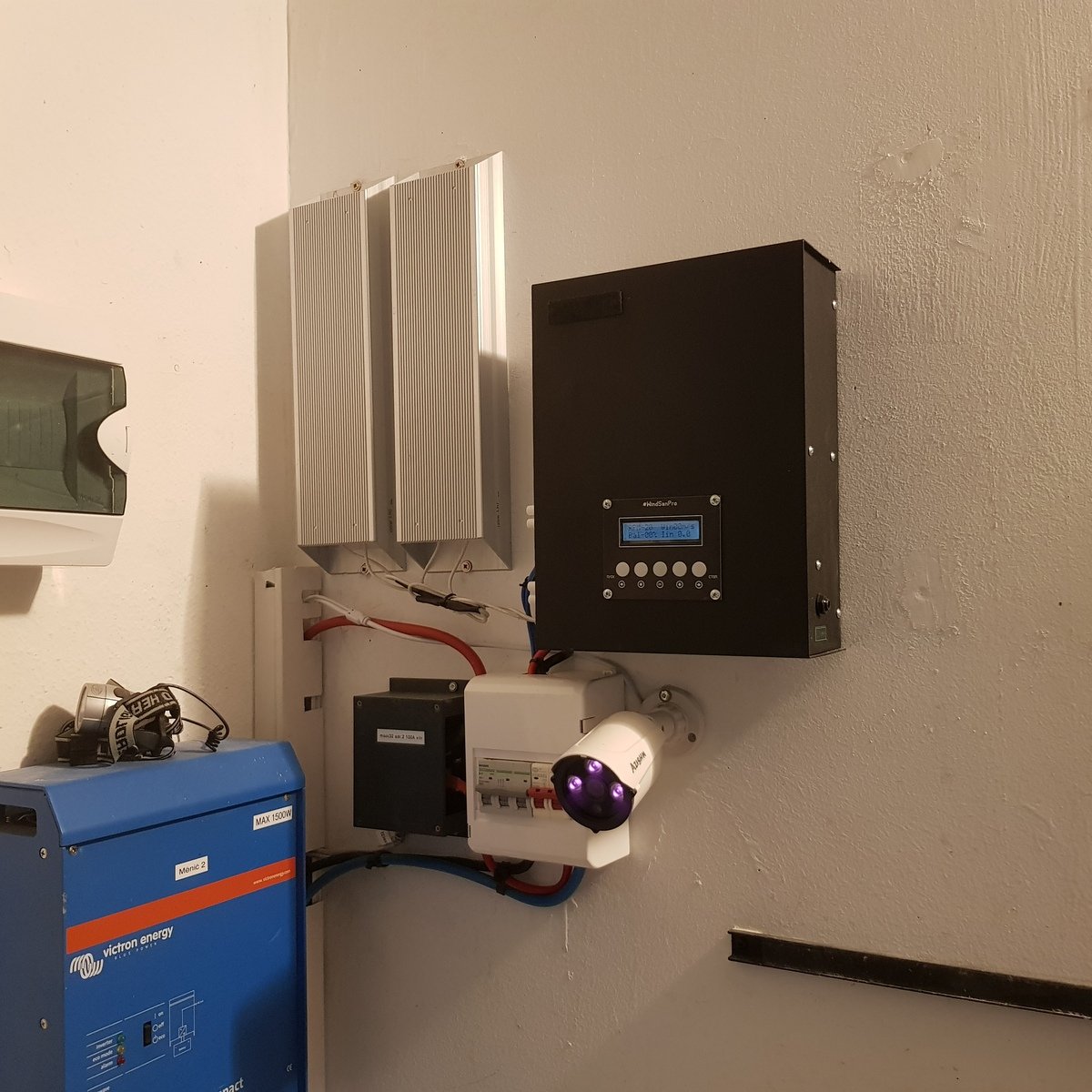 Provoz větrné turbíny hlídá regulátor WindSanPro-150 z Ukrajiny (na obrázku je ještě zachycen kousek historie - místo stávajícího Multipus II jsem dříve používal Victron Inverter Compact 24/2000 - narozdíl od Multipus II 24 / 5000 byl zcela tichý, u Multiplusu II trochu drnčí transformálor - je to ale snesitelné