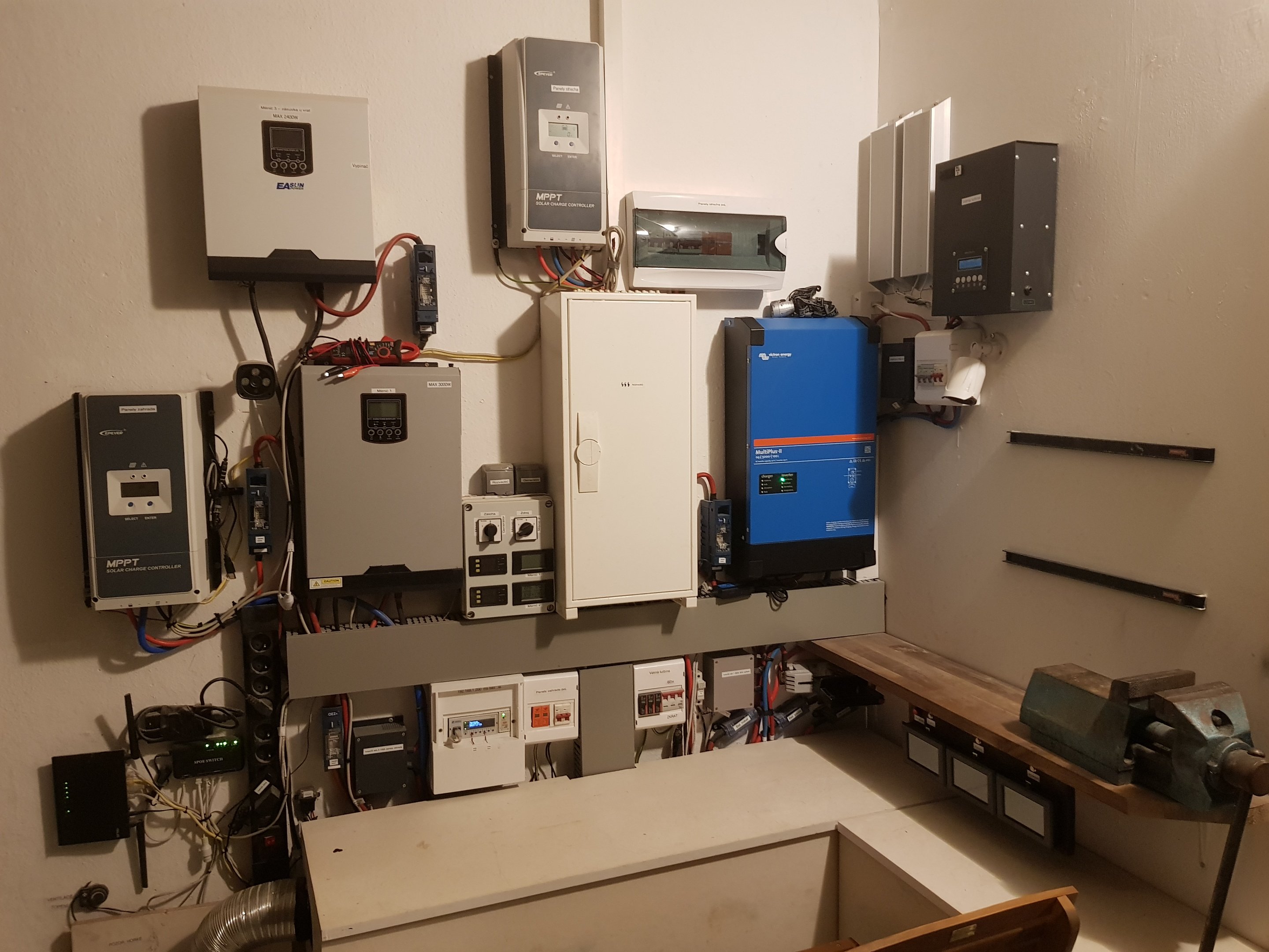 Victron Multipus II 24/5000, v pohotovosti (ale většinou vypnuté) ještě Axpert VM II 24V 3000W PF1 + EASUN POWER Solar Inverter 3KVA 24V 220V