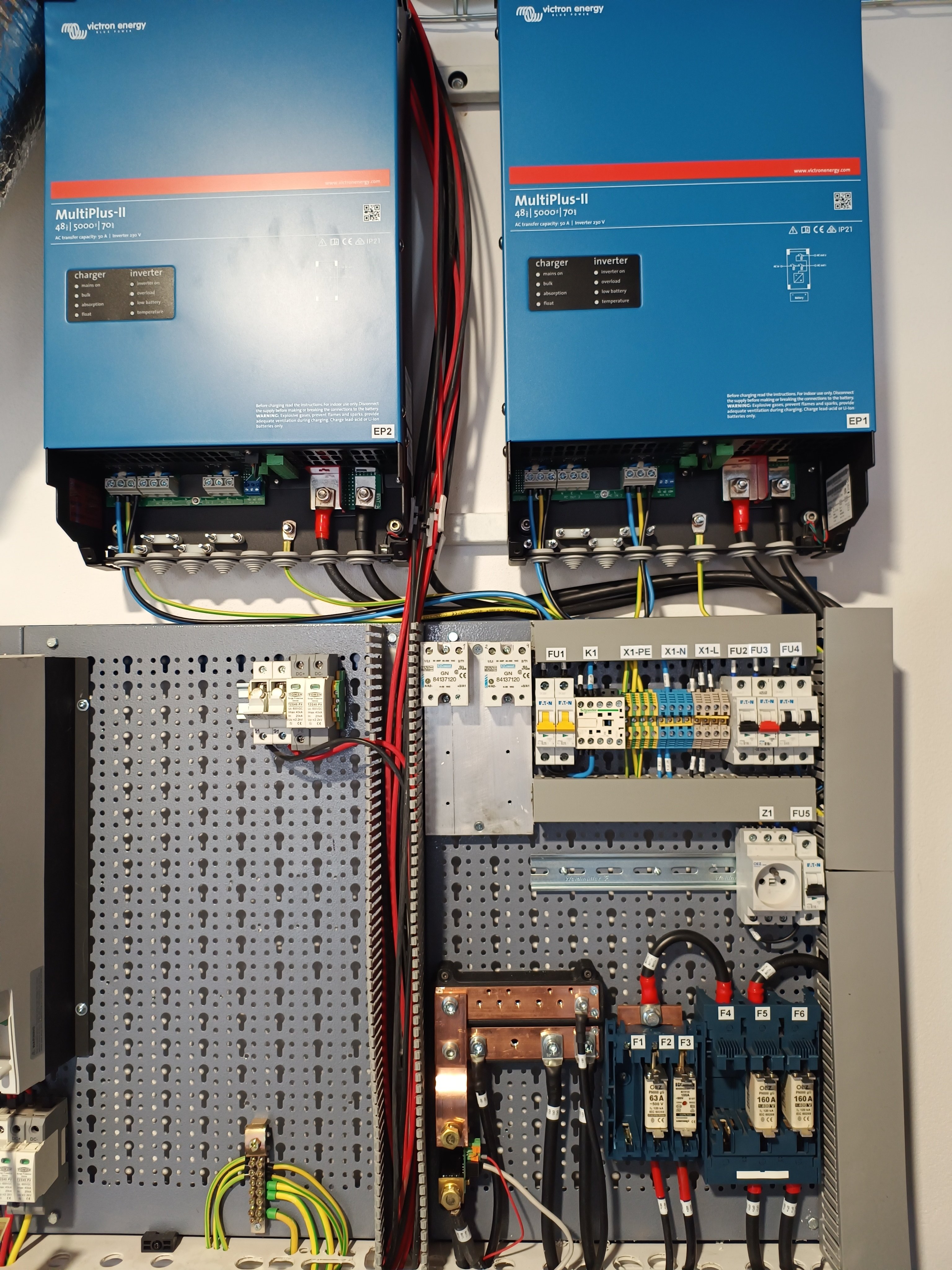 Kompletně zapojeno, EPevery už nabíjí, střídače běží, i když zatím v "ručním režimu".