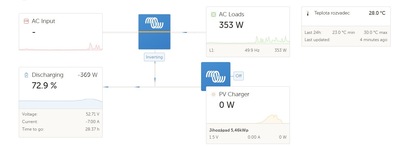 ostrov skoro 8kWp neustále ve stádiu zrodu: smartshunt(ex WBJR), MPPT150/45, MPPT 250/100(ex midnitesolar 150 clasic lite), 16S a různě P cca 340Ah Winston, MP II 5000,( ex Powerjack 8kW, ex samodomo cca 4kW). 48V DC rozvody a spotřebiče.