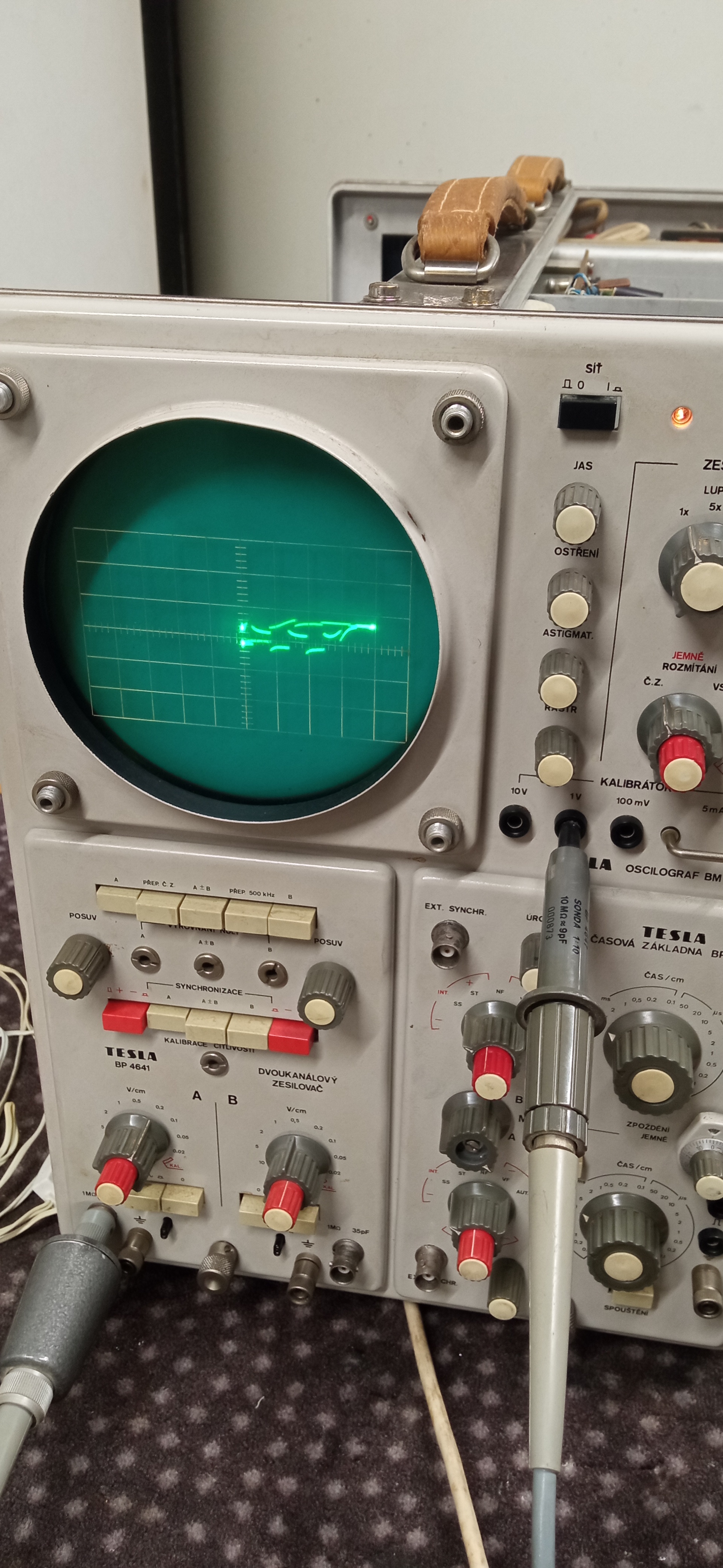 To na prvním obrázku vypadá jako nějaká křivka zobrazovaná na X-Y vstupu. Obrazovka je pravděpodobně OK. Ale tohle spravit bez osciloskopu a dokumentace asi nemožná věc. Jestli chceš osciloskop, kup si levnej digitál, i ten nejlevnější 8bit z aliexpresu udělá víc práce než tohle. https://www.aliexpress.com/item/1005004 ... 4259418%21