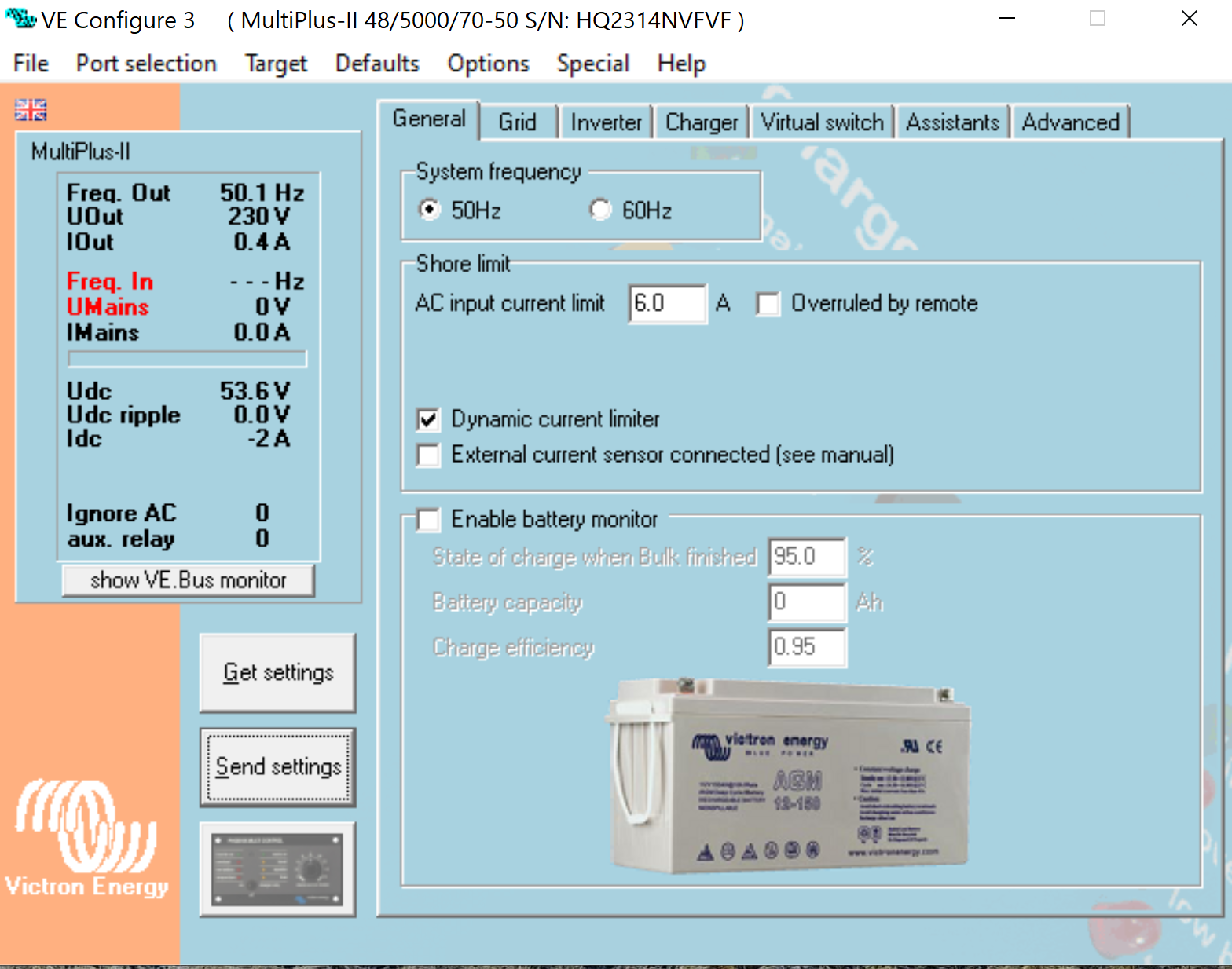 VICTRON doporučuje 80% výkonu generátoru. Při nominálu 2800W, je 80% 2240W, což je 9,7A max nabíjecí proud. Pokud nastavím max 9A Charge current v záložce Charger, tak to znamená maximálně 9A x 48V = 432W nabíjecí výkon. Což by souhlasilo s tím, co jsem z toho dostal cca těch 400-500W kolísavých.