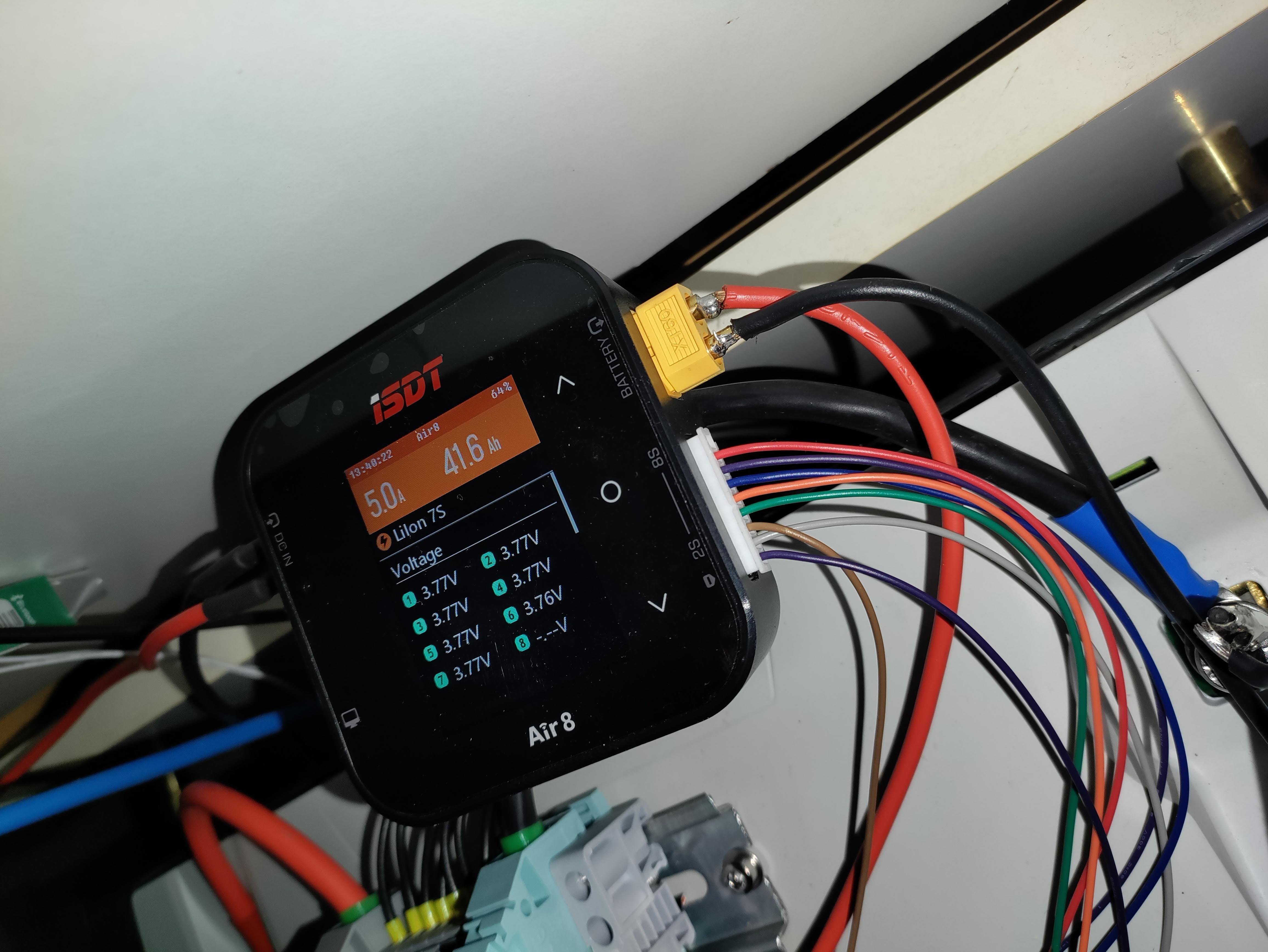 Ja to mam takto: vyvedene vodice ku kazdemu clanku baterie, vies sa napichnut na lubovolny clanok bez rozoberania pripojenie silovych a servisnych vodicov do nabijacky jedna z troch obrazoviek - napatie jednotlivych clankov, druha zobrazuje vnutorny odpor jednotlivych clankov, tretia prehladove info nabijacky (vstupne napatie, prikon, vystupne napatie, vykon nabijania, teplotu pristroja, ...)
