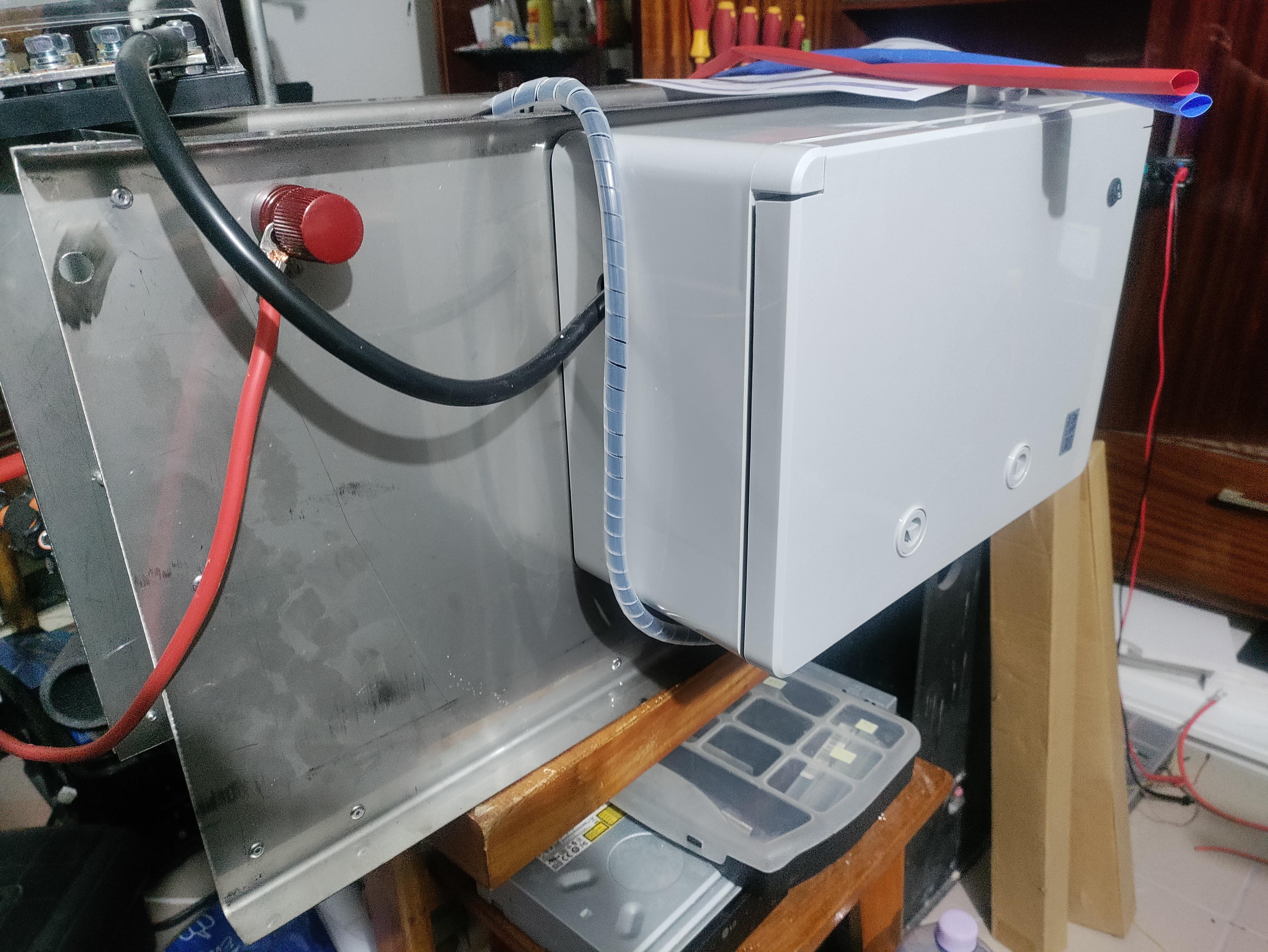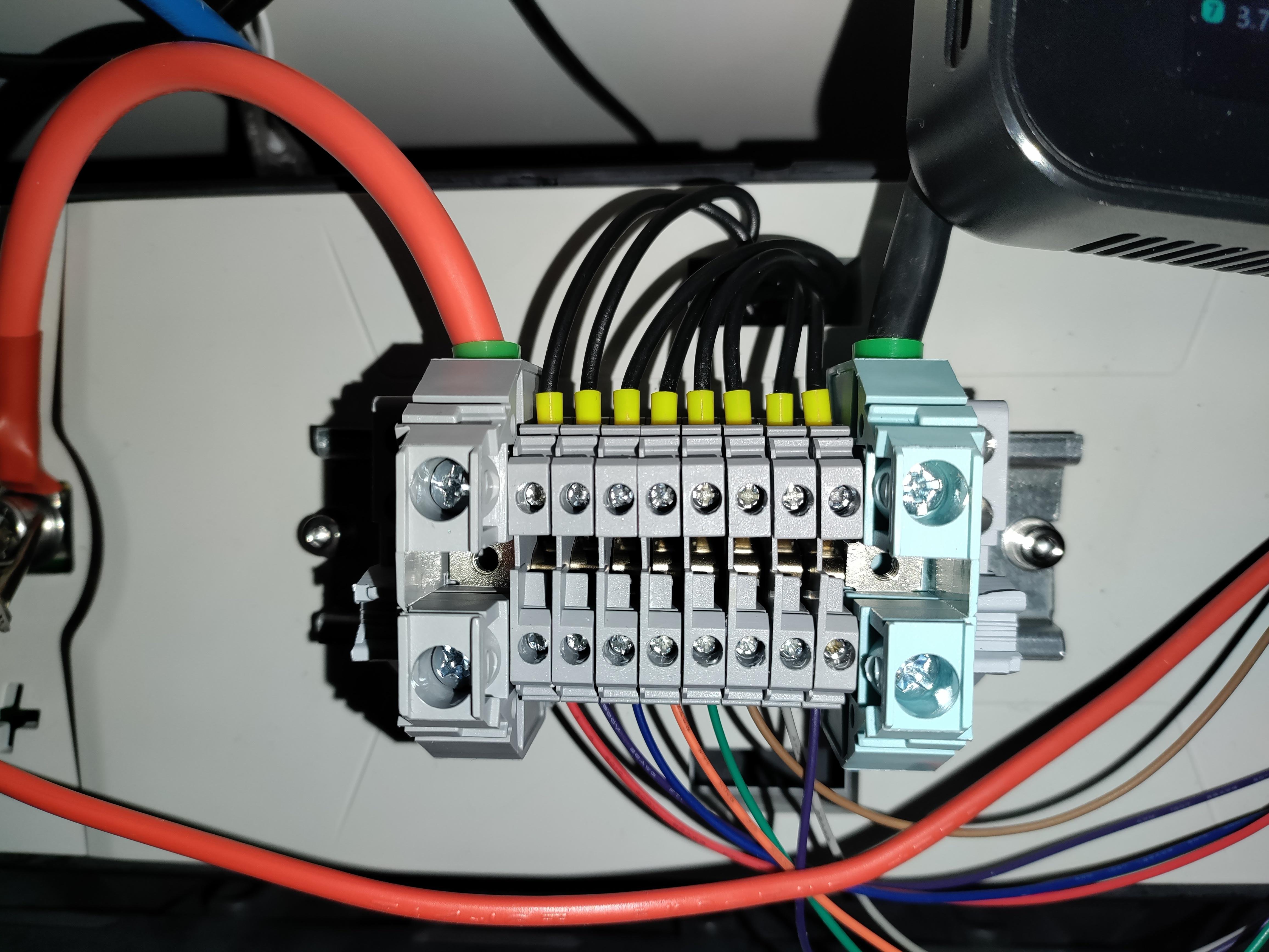takto vyzera skrinka so svorkami, kam su privedene kabliky z kazdeho clanku. Do svoriek je pripojena BMS a prelievacie pumpy