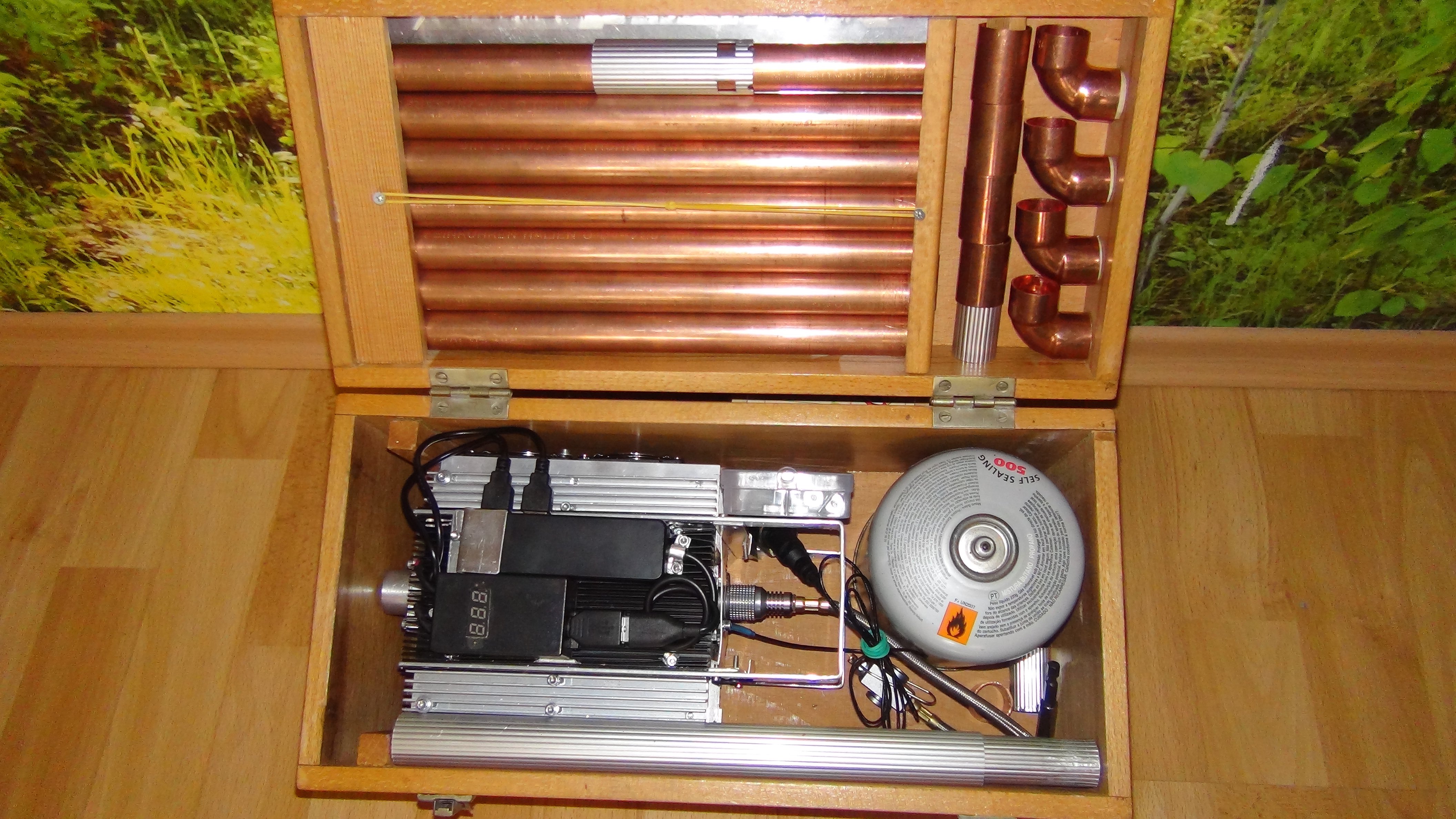 Celá zostava je uložená v drevenej truhlici, ktorá slúži ako stabilná podstava pri chode. Tepelný výkon generátora je max. 800W, teplota výstupného vzduchu z ventilátorov je cca 36stC, na potrubí spalín sa pol metra od generátora dá udržať ruka.