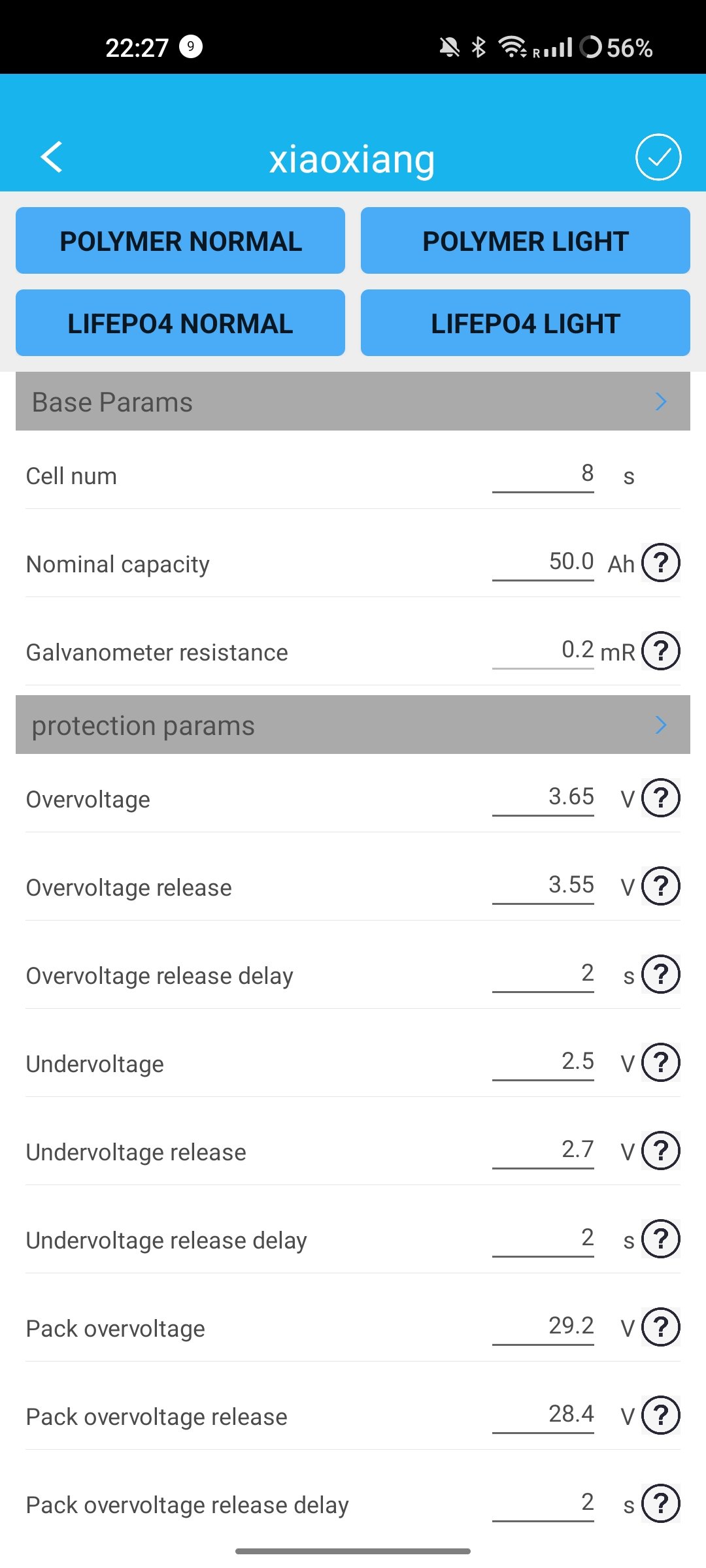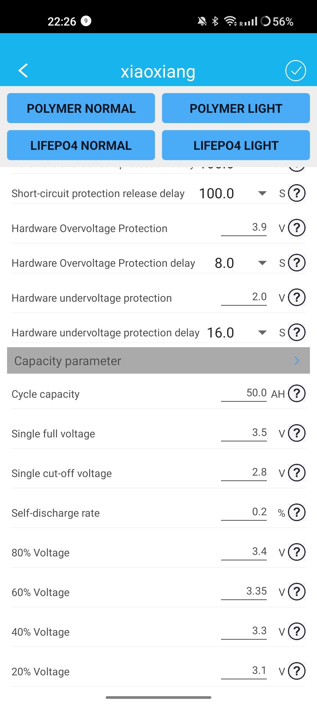 Zmenil som nastavenia v aplikácii pre bms a klesla kapacita z 50ah na 40ah a nie a nie nastaviť, aby som mal 50ah. Ako to máte nastavené?