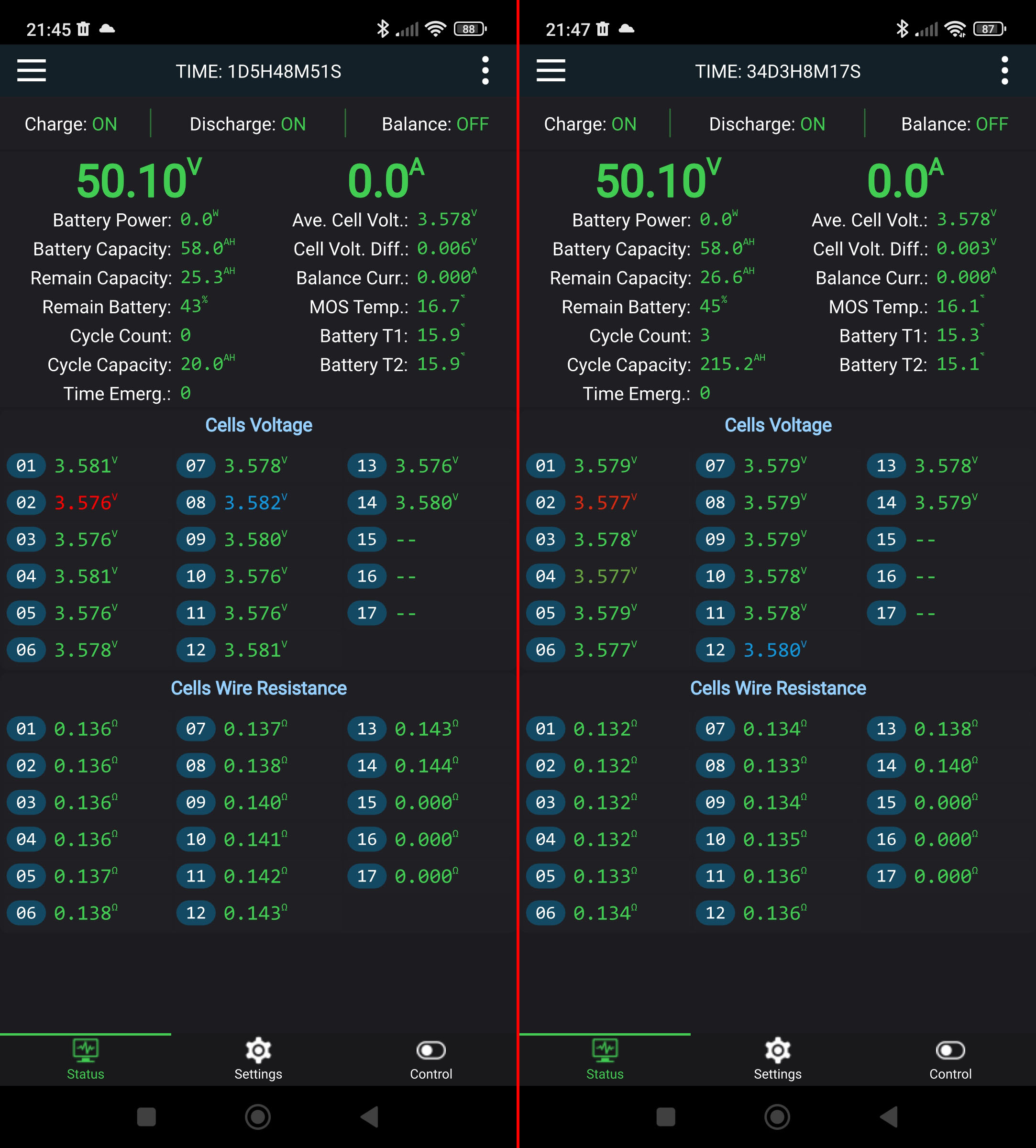Mám tam dve identické JK-BMSky, dnes večer bol rozdiel len 0,2V.