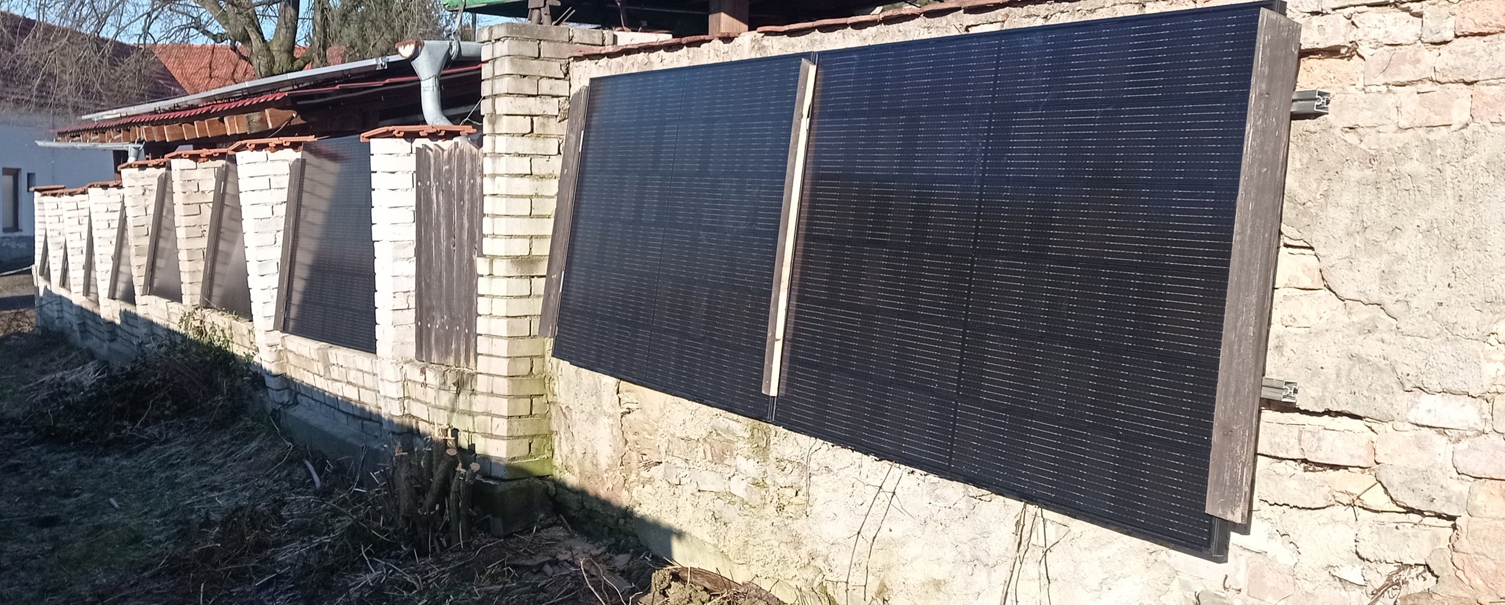 Konečně přes víkend lepší počasí, tak solární plot stojí. Jen jsem zase změnil zapojení a aby to šlo přidat jako další string k FV poli na střeše u plotu, musel jsem jich zapojit 9 do série. Proto jsou dva panely připevněny na opěrnou zeď.