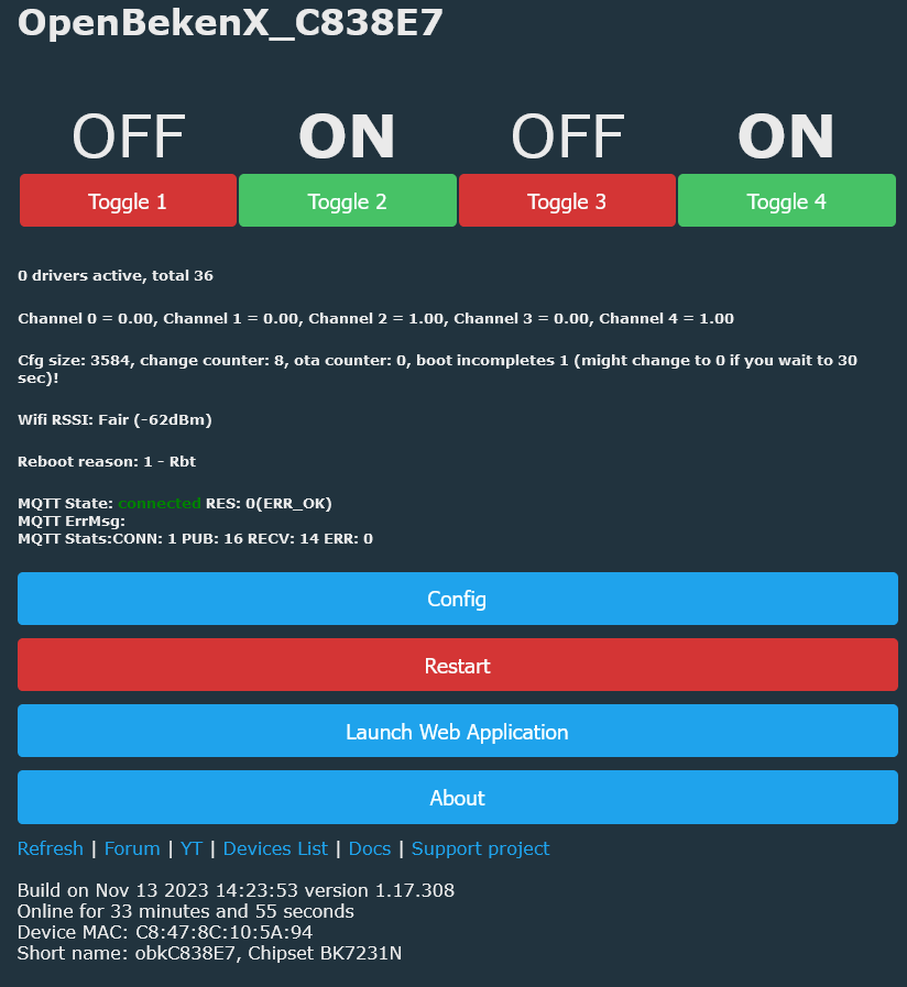 Musel jsem škrábnout plošňák, protože piny TX a RX se tady používají i na tlačítka a bez přerušení plošňáku za nimi to nekomunikovalo. Příjemné je, že se na zařízení mohu podívat a nastavovat ho přes webové rozhraní (obdobně jako zařízení Shelly):