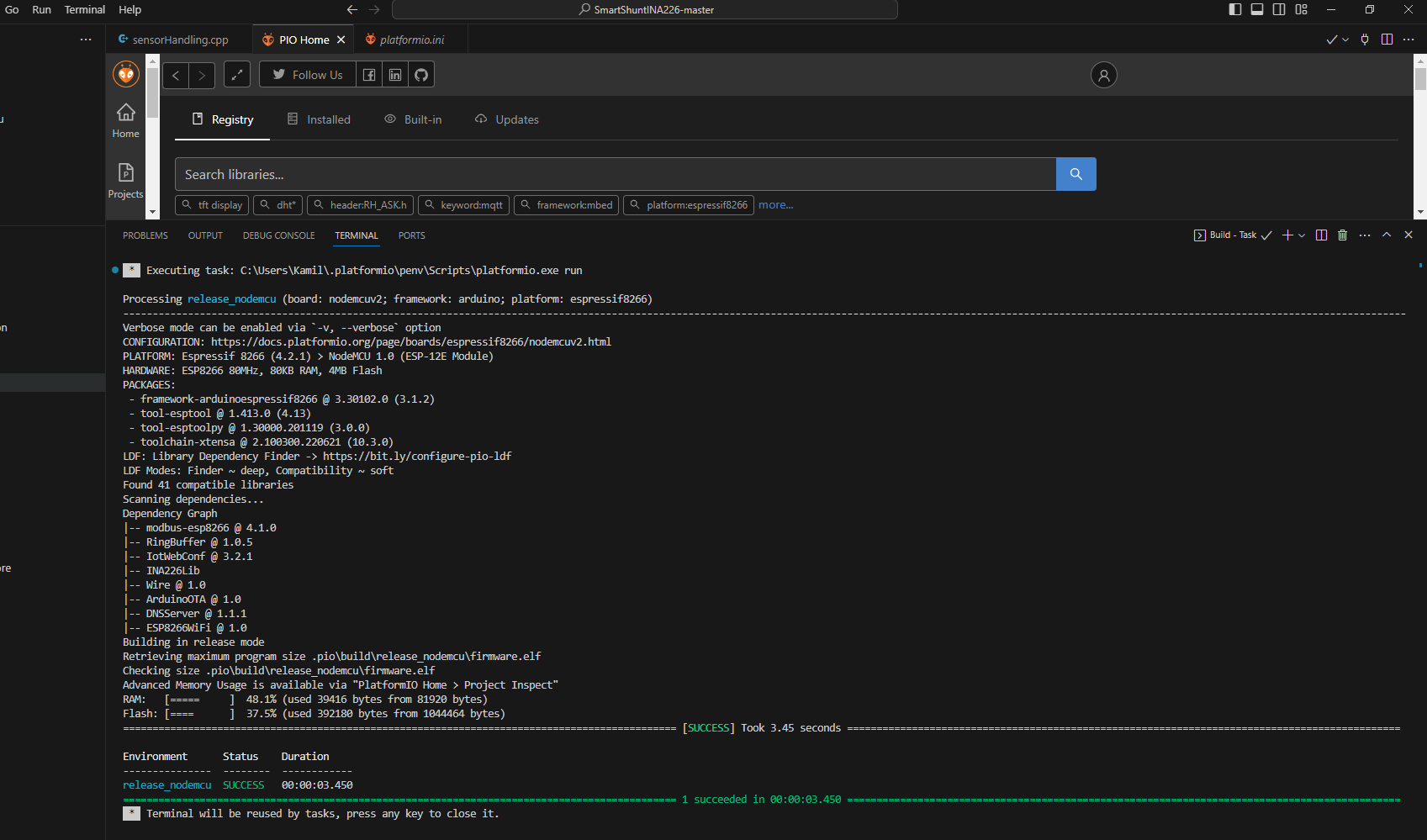 VisualStudioCode jsem měl z pokusů s tím elměrem, no, tak platformIO nainstalované, stažené source z githubu, při prvním pokusu o build to řvalo něco o chybějící ina226,h, tak jsem to na tom githubu našel a stáhl z dalšího, pleskl do lib, tak to pak už neřvalo. Tak to půl minuty něco dělalo a končí žlutým textem