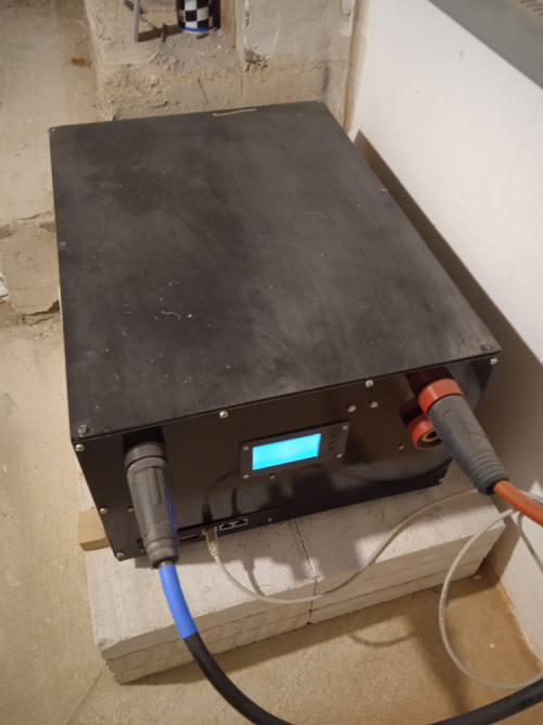 Z venku obalené polystyrenem a OSB deskou. Mám tam 4 sady po 48V. Mezi každou sadou bloků mám vložené dvě magnezitové cihly a mezi cihly topné tělísko a kolem baterek v rohoži vložený topný kablík, který je napřímo na 48V hlídaný přes napětí a relátko.