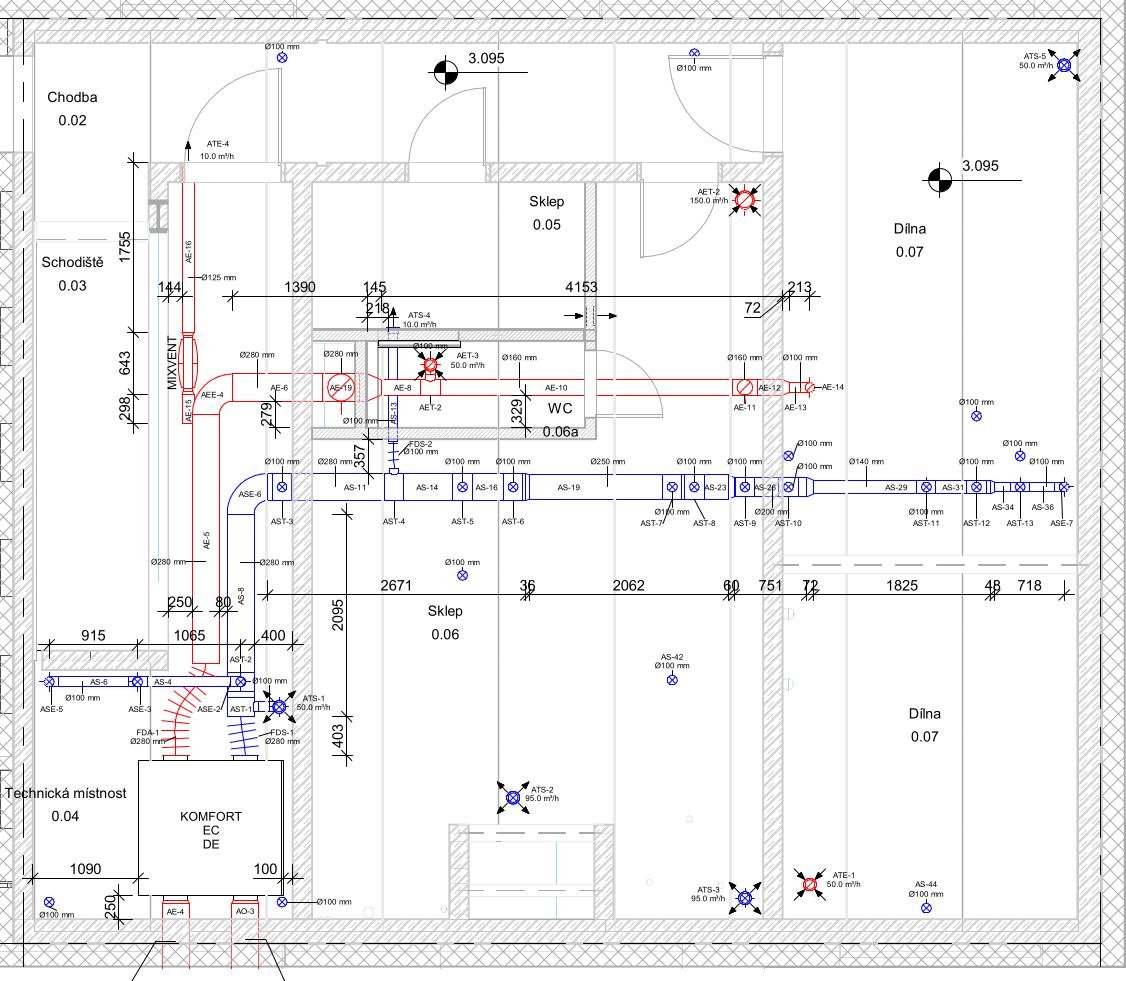 entalpické výměníky měly - alespoň když se vybíral přístroj - nižší účinnost a u nás ten problém se suchým vzduchem v zimě (a vlhkým v létě) díky zmíněné vzdušné studni nenastává. Tady bylo směrodatné provedení upevnění na strop a dostupnost v "pravé" i "levé" variantě abych to mohl realizovat bez klikyháků. Pro představu, tohle byl návrh technologa od architekta: (dole je východ, vpravo je sever) a ta červená ven je vlastně 'výfuk' který je veden na sever (do prava) a tím pádem zase kříží nasávání od vzdušné studny. Tam se počítalo s nějakým Atrea Duplex 1500 Multi Eco – Vjosse píše: pát úno 23, 2024 7:52 pmJaké argumenty tě přesvědčili do NE-entalpického výměníku, na tom odkazu je obyčejný polystyren.