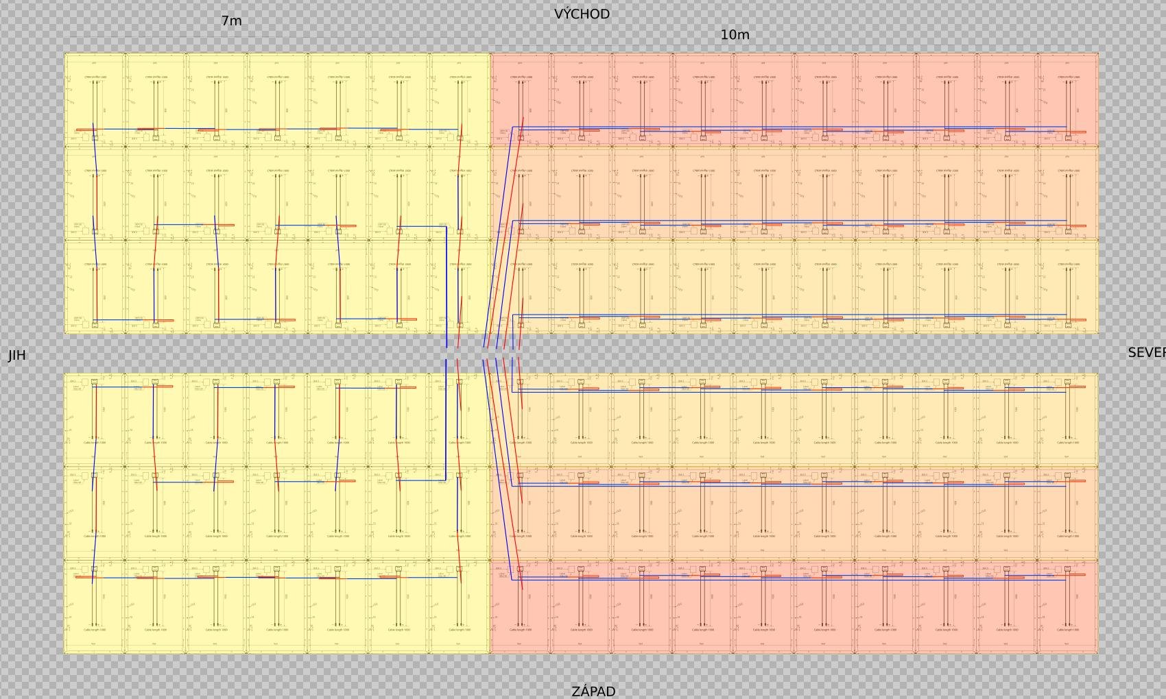 51 (3x17) na východní, 51 (3x17) na západní střeše (35°), viz (pohled zespoda) 21s1p -> Fronius jeden MPPT východ, jeden MPPT západ