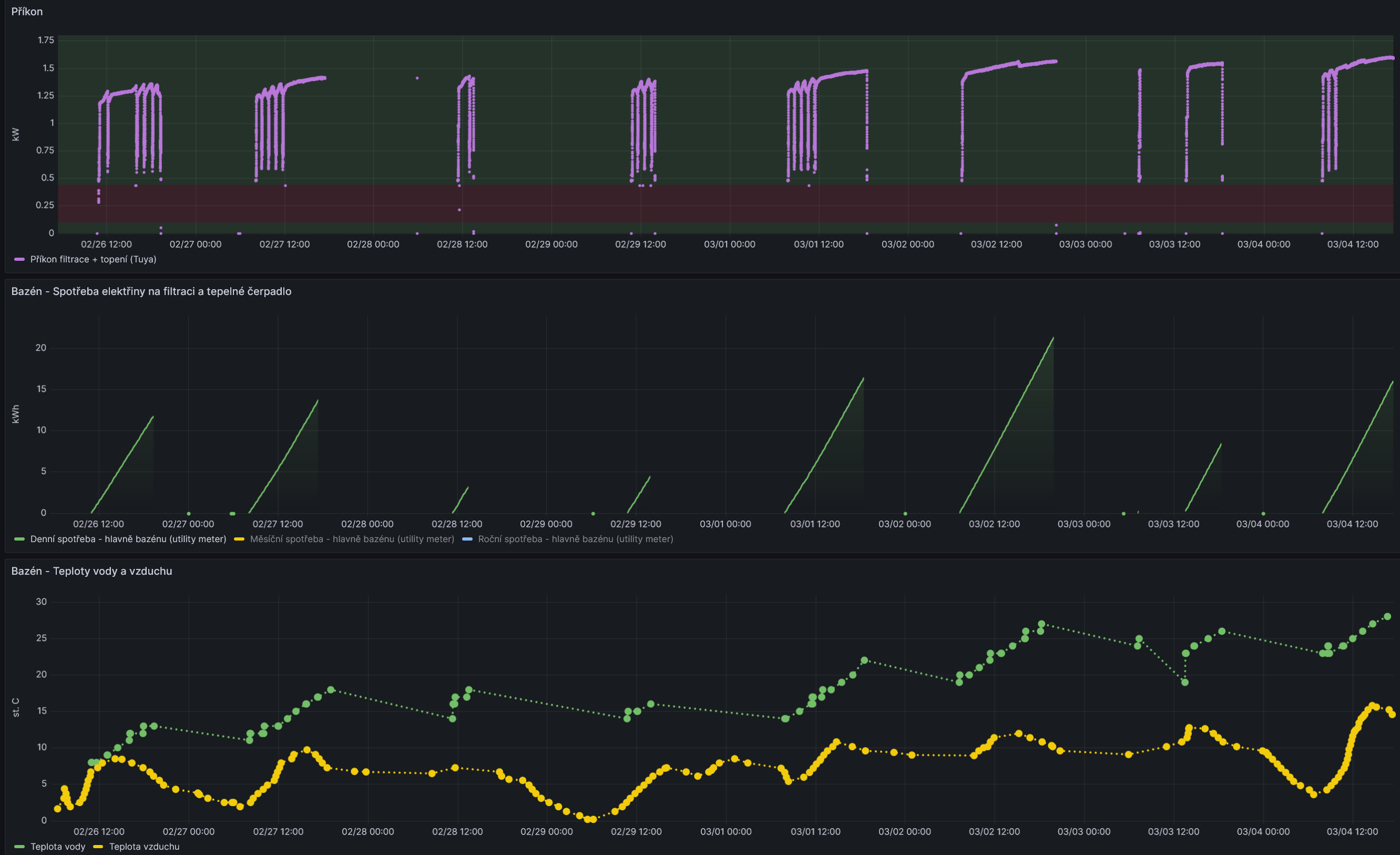 Koncem února začaly přebytky, tak jsem začal ohřívat bazén. Původně to vypadalo, že koupací sezónu zahájíme už v únoru, ale slunce zmizelo, přebytků bylo méně a bazén se ohříval pomaleji. Při těchto teplotách vzduchu se zhruba za 90 minut ohřeje o 1 st.C. Dnes se ohřál na 29 st.C, takže první letošní koupání: