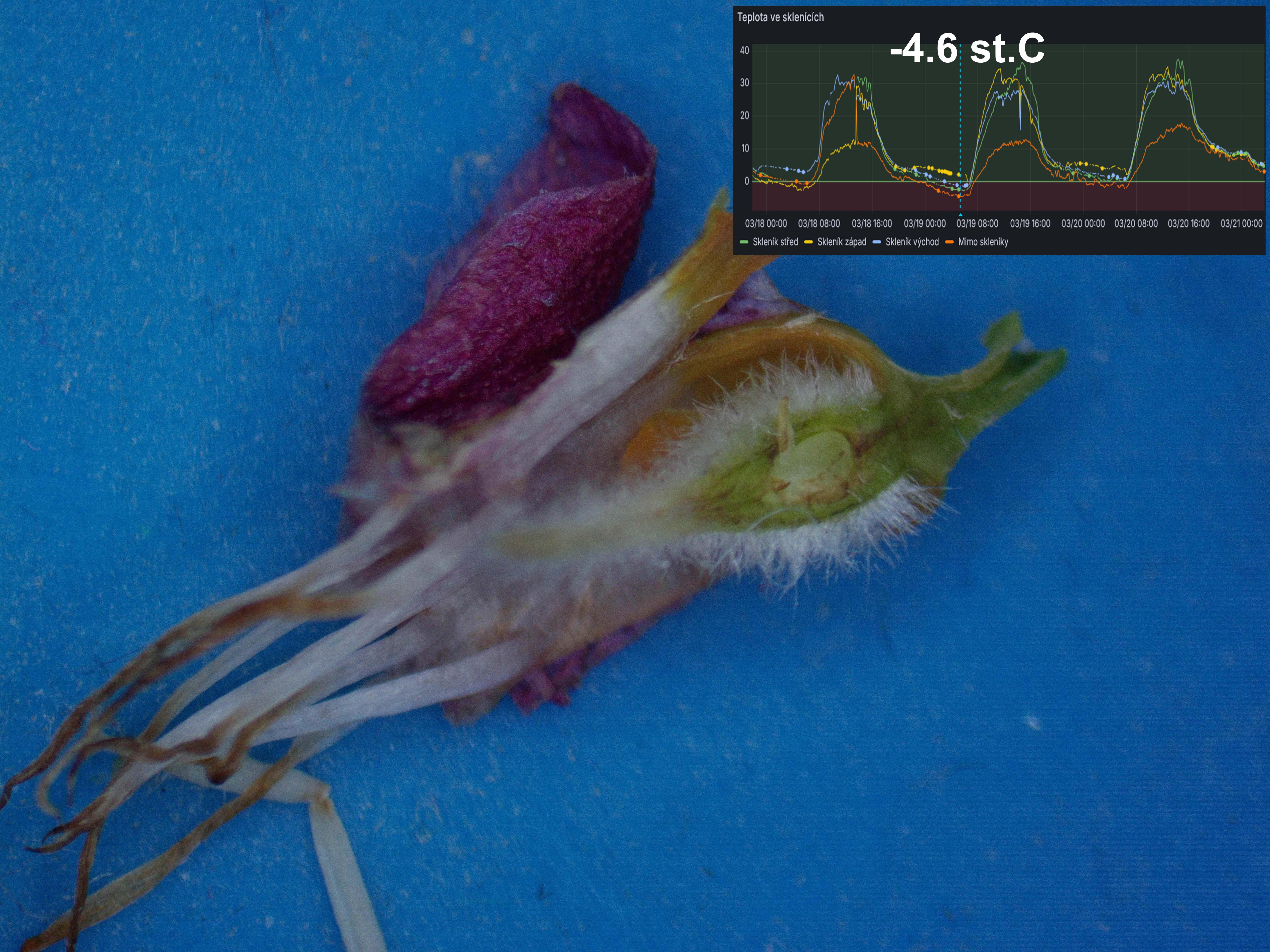 Fotovoltaika pomáhá i proti jarním mrazům na zahradě. Jeden skleník se sadbou jsem vyhříval infratopením 1 kW a vše přežilo (spínání řídila automatika v Homeassistant (infratopení bylo v chytré zásuvce ShellyPlug, teplotu monitoruje ShellyUni). Meruňky na zahradě byly preventivně postříkány prostředkem Champion (účinná látka je hydroxid měďnatý a když se koupí jako chemikálie, vyjde několikanásobně levněji). Výsledek na jednom rozlouplém květu vypadá nějak takto (dle mě jako amatéra snad není zmrzlý):