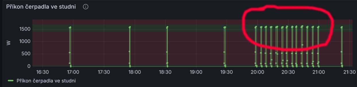 Zkouším to detekovat tak, že počítám (Node Red) AVER (klouzavý průměr časů mezi sepnutím čerpadla) a pokud tento klesne pod nějakou hodnotu, usoudí se, že je nezavřená voda a vypne se napájení čerpadla (to je zapojeno přes Shelly plug):