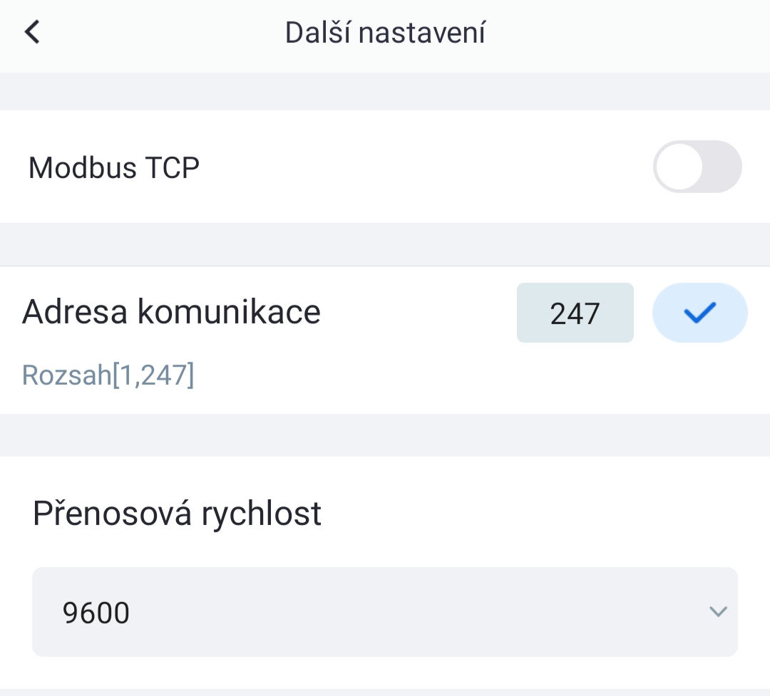 Teď ale k tomu nejpřínosnějšímu. Po aktualizaci FW, se v aplikaci objevila možnost pro nastavení Baudrate. Najdete to pod více (...) -> Nastavení komunikace -> Další nastavení. U starší verze FW bylo možné nastavid ID měniče a povolit modbus TCP, který mi přes WiFi modul stejně nefungoval. Takže s novým FW ani nemusíte kupovat LAN modul, ale stačí to změnit v aplikaci 8-)