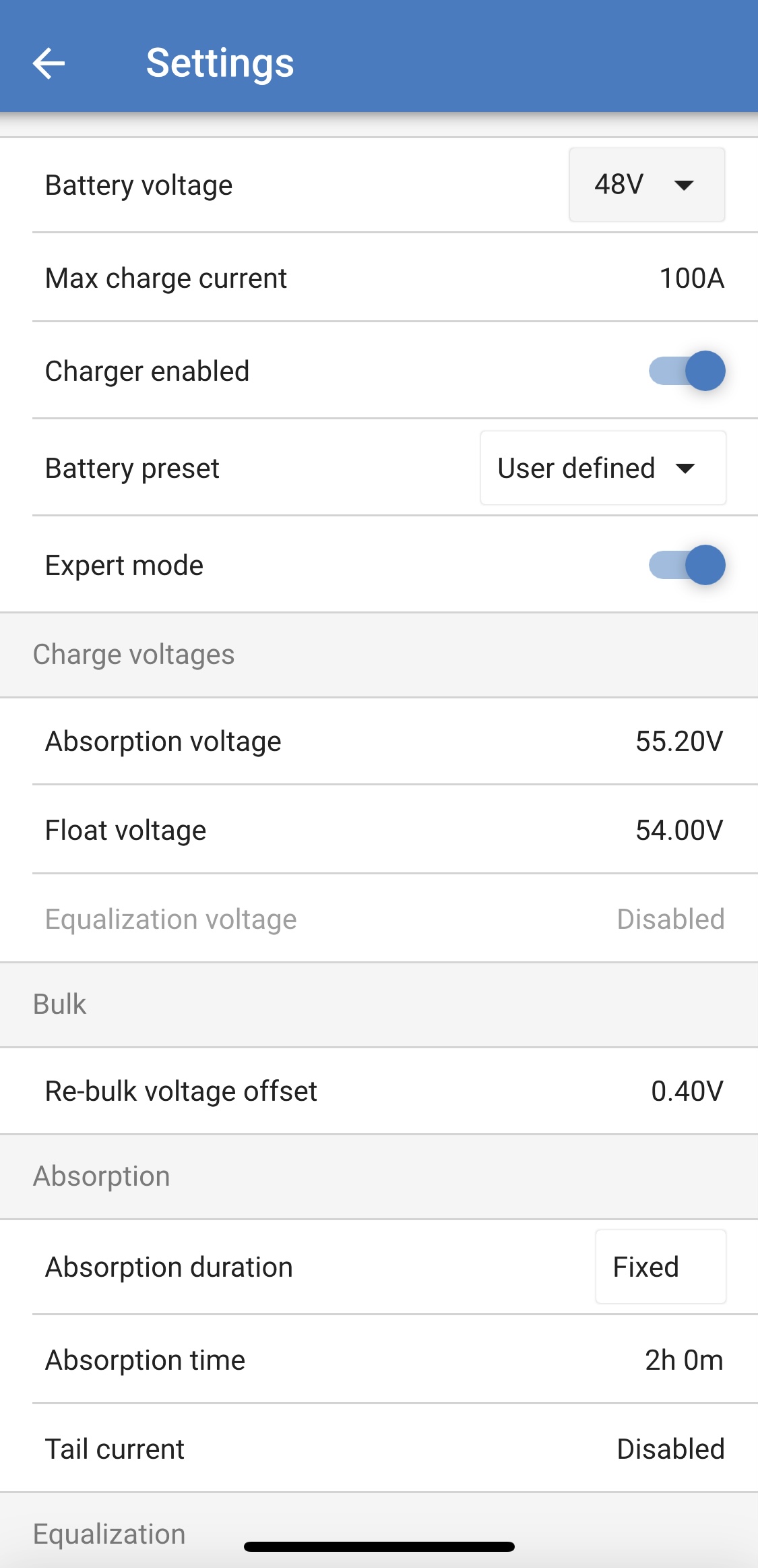 No tak prvně bych na BMS nastavil start balance volt na 3.4, Andy říká dokonce 3.45V. druhá věc 55.2 ABS asi ok(v létě stačí níž třeba 54.4V), ale Float stačí 53.5V.