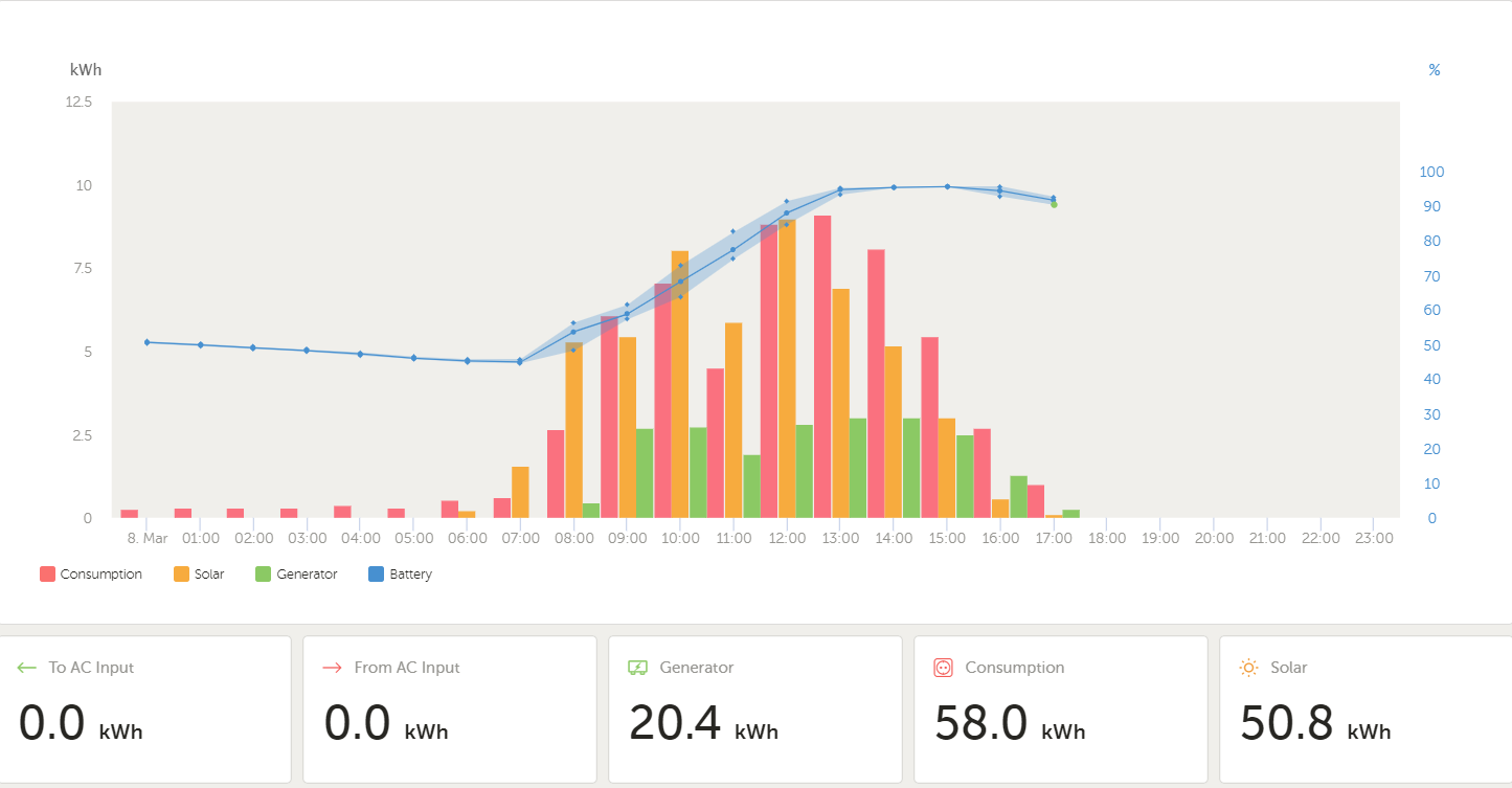 U me zatim od zacatku roku 372kWh abych vydrzel v tomhle obdobi v ostrovu potreboval bych vetsi aku a dalsi panely, mame denni spotrebu cca 15kwh. U rodicu od zacatku roku 285kWh, jsou na tom lepe nemaji takovou spotrebu tak vydrzi v ostrovu dele i pri horsim pocasi a zatim nemaji hotovou klimu na vytezovani takze neco zustalo i na strese. Snad uz to pocasi bude jen lepsi:-)