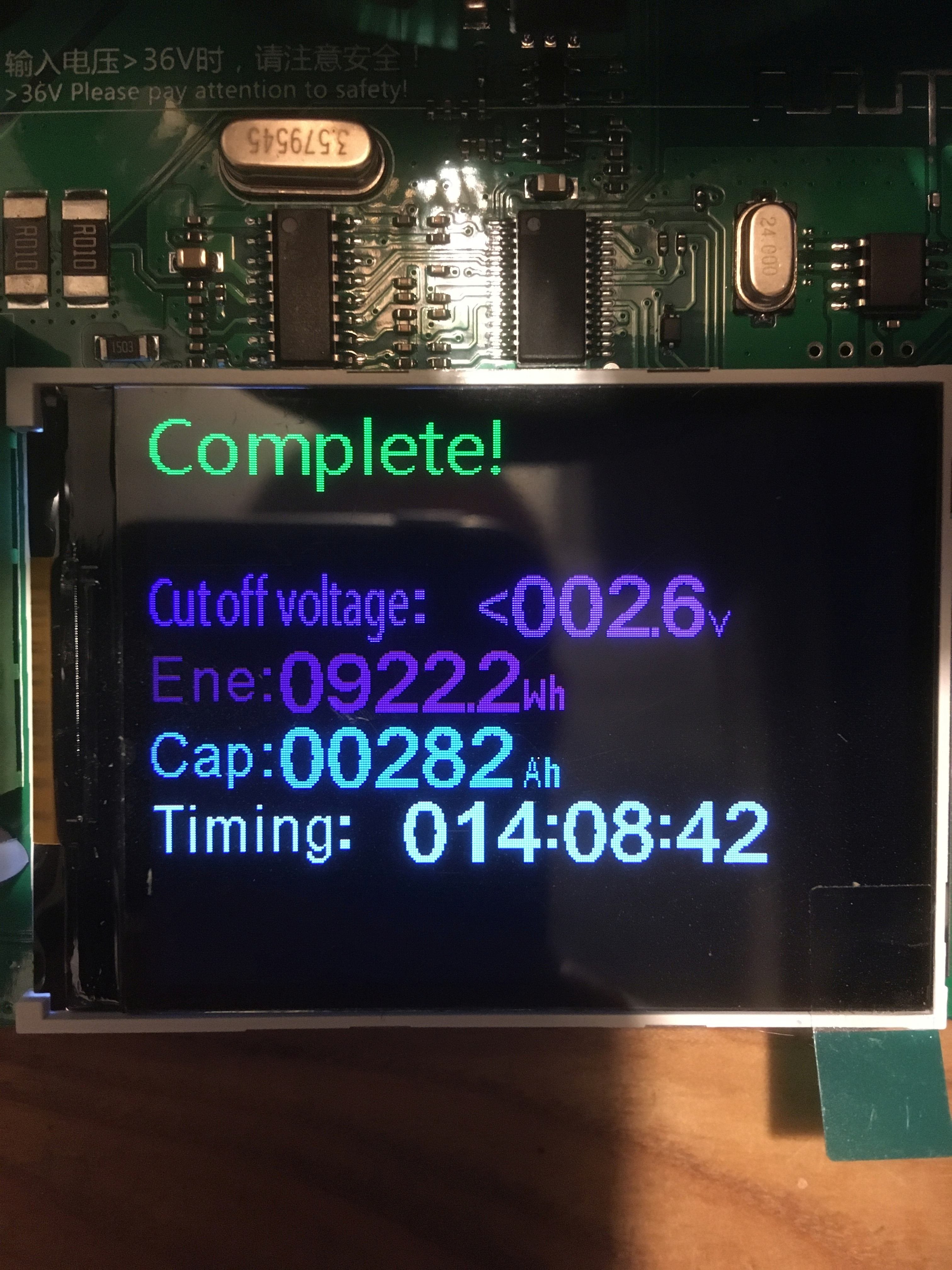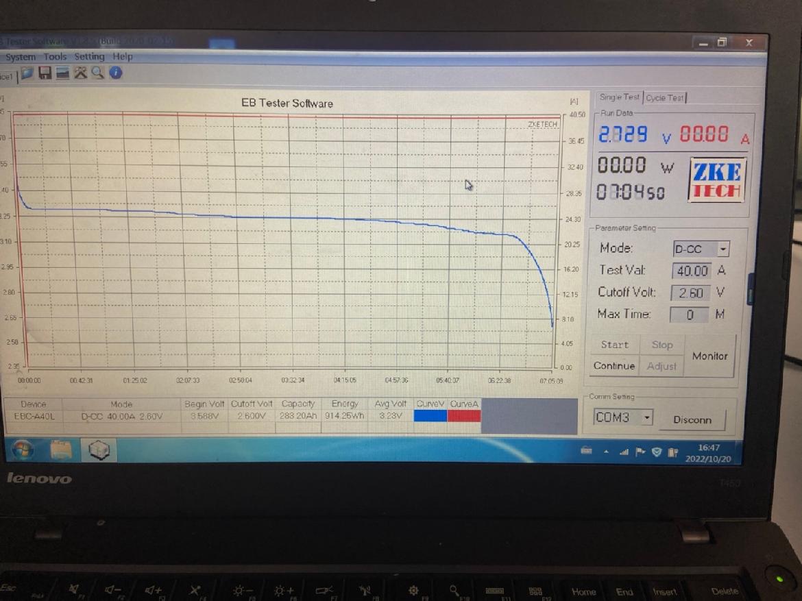 Nabil jsem je na 3,55 V a nechal vybíjet na 2,6 V trvalým proudem 20A. Kapacitu mi to naměřilo 282 Ah.