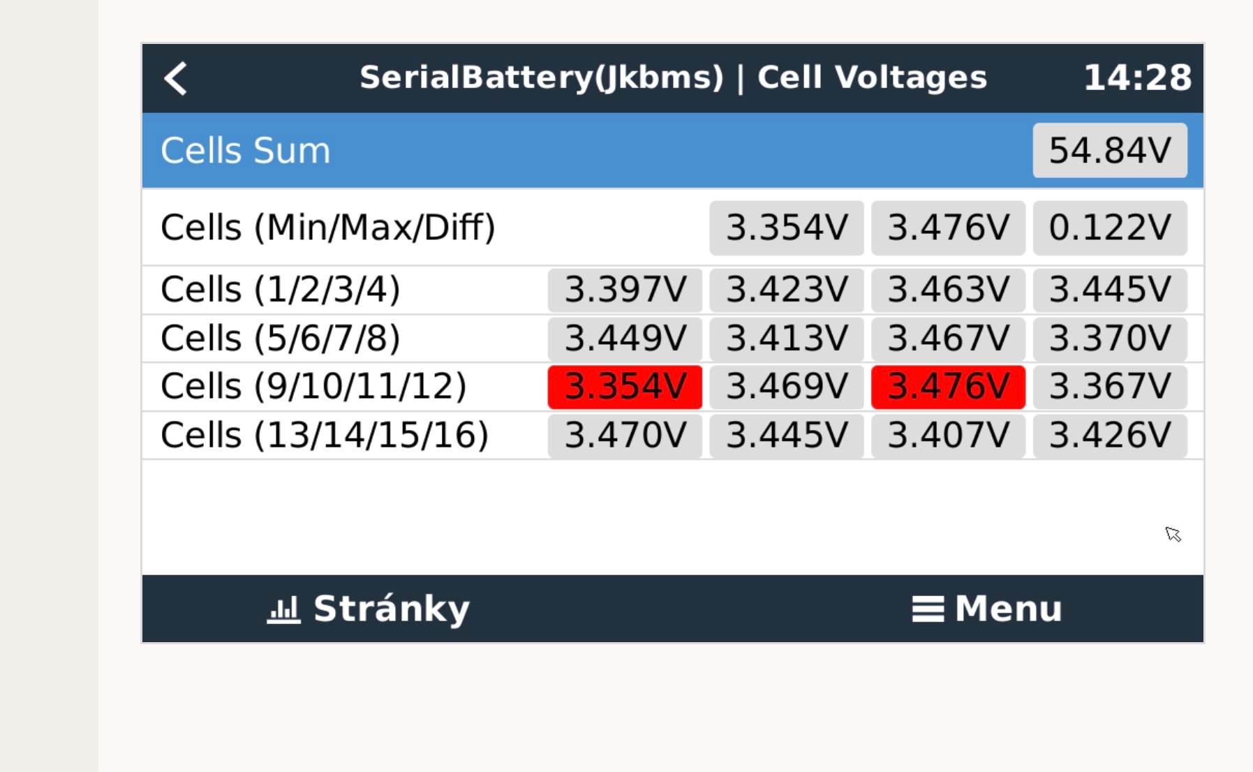Mrknu na kontakty stejne jsem chtel vymenit bazenovou folii mezi clankama za ten sklotextit 0,8mm. Jinak ja mam balancer jen co ma JK BMS 2A. Upravil jsem ABS 54.4V/30min, Flot 53,92 ale zase kdyz je baterka na 80% a panely jednou plny vykon tak to rychle skoci do ABS.